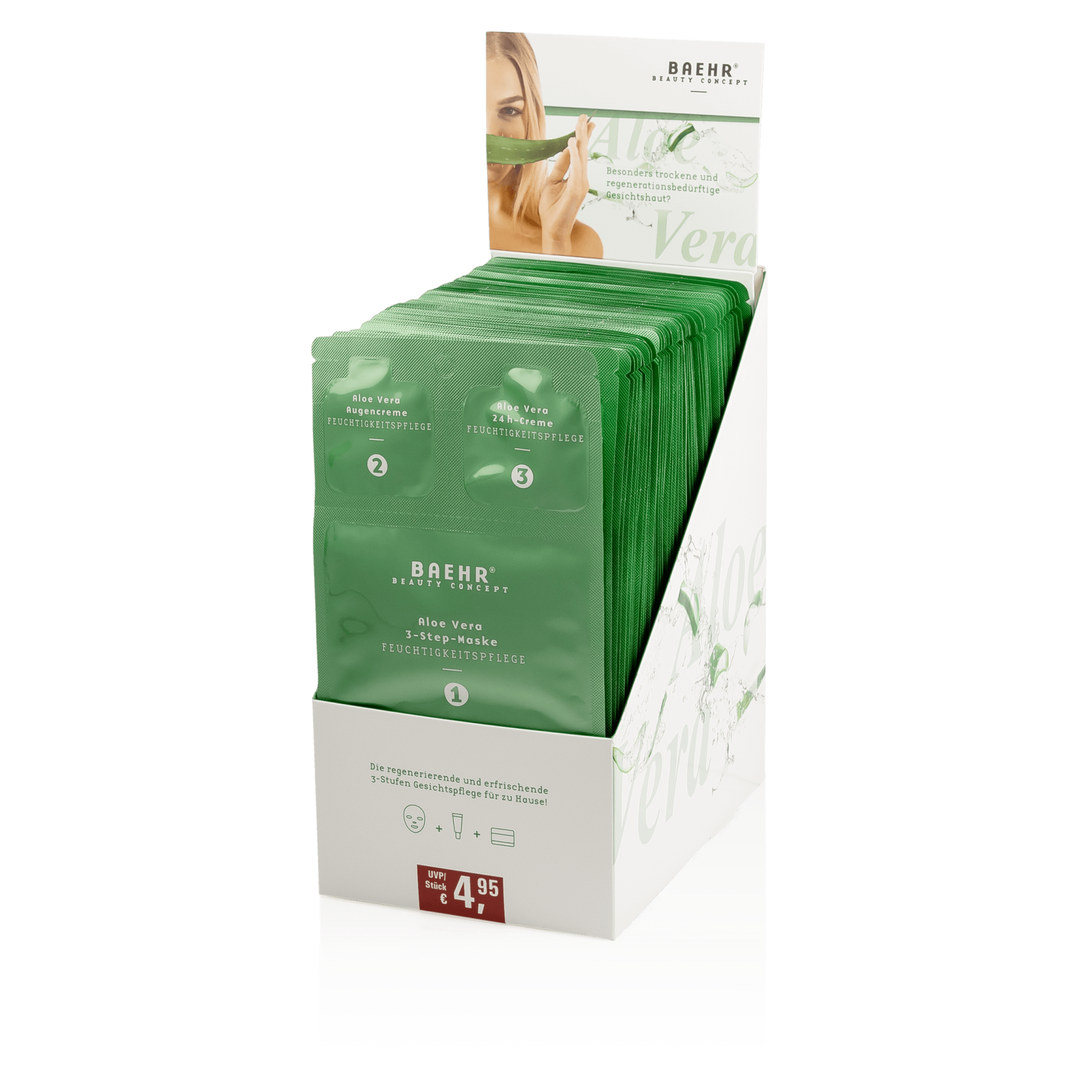 Das Pflege-Highlight in Ihrem Studio: Präsentiert im schicken Kartondisplay stehen 50 Einzelpackungen der BAEHR BEAUTY CONCEPT Aloe Vera 3-Step-Maske für Ihre Kunden zum Verkauf bereit. Durch eine gute Platzierung sichern Sie sich einen lukrativen Zusatzverkauf und bieten Ihren Kunden ein einmaliges Pflegeerlebnis.