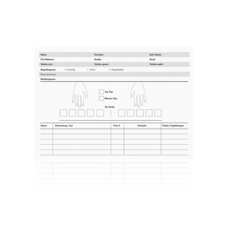 Stellen Sie sich vor, Sie haben alle wichtigen Informationen zu Ihren Kunden und deren Terminen an einem Ort. Kein langes Suchen mehr, keine verpassten Termine. Mit den Nail-Karteikarten haben Sie alles im Blick. Sie schaffen eine Verbindung zu Ihren Kunden, indem Sie individuelle Produktempfehlungen und Notizen festhalten. Jeder Kunde fühlt sich besonders und individuell behandelt. Jeder Termin wird zum Erfolg. Ihre Arbeit wird nicht nur einfacher, sondern auch effizienter. Steigern Sie Ihre Professionalität und Ihren Erfolg mit den Nail-Karteikarten. Sie werden sie nicht mehr missen wollen.
