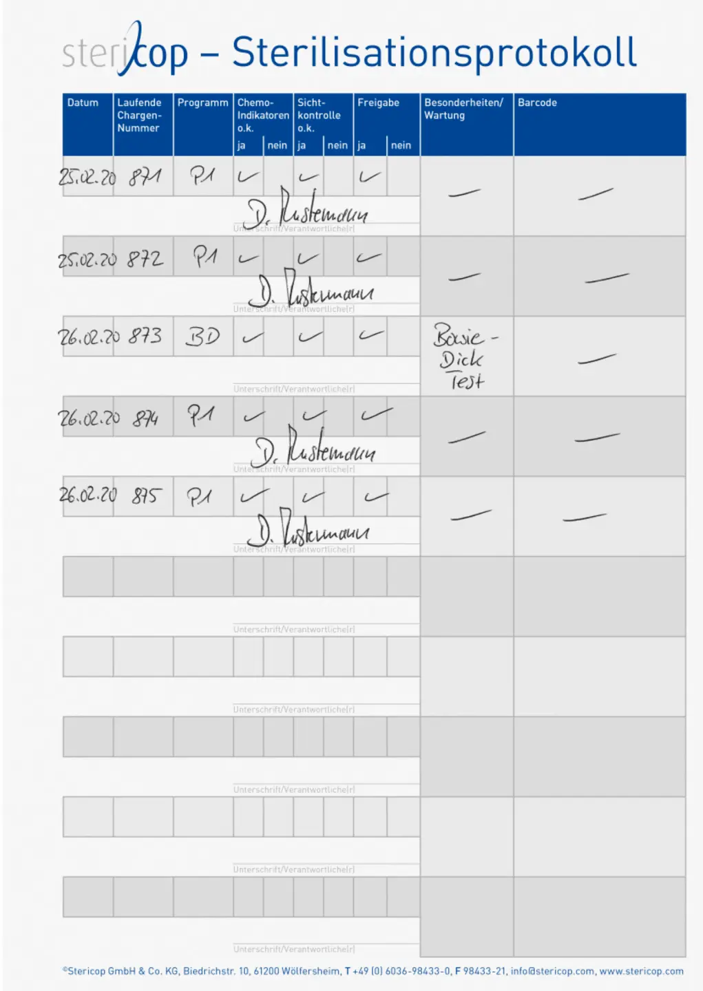 Das SteriCop Formblätter-Ergänzungspack ist ein unverzichtbares Instrument für medizinische Einrichtungen, um eine lückenlose und gesetzeskonforme Aufzeichnung von Sterilisationsprozessen sicherzustellen. Diese Formblätter tragen zur Qualitätssicherung und Patientensicherheit bei.
