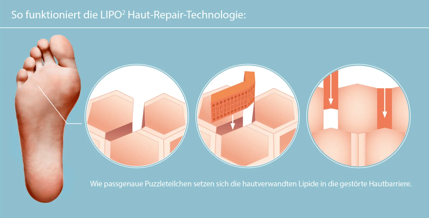 Die Podoexpert Repair Creme wurde zur täglichen Pflege rissiger Fußhaut entwickelt. Sie repariert und regeneriert die Schutzbarriere der Haut. Zudem spendet das Produkt Feuchtigkeit. Die Creme beinhaltet die patentierte BarrioExpert LIPO2 Haut-Repair-Technologie auf Basis hautverwandter Lipide, die sich passgenau in die Hautbarriere einfügen und diese so stärken, schützen und reparieren.