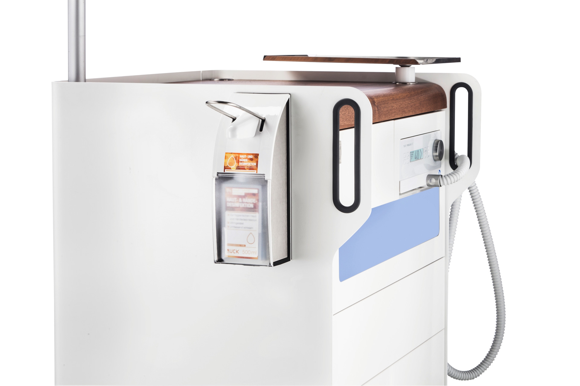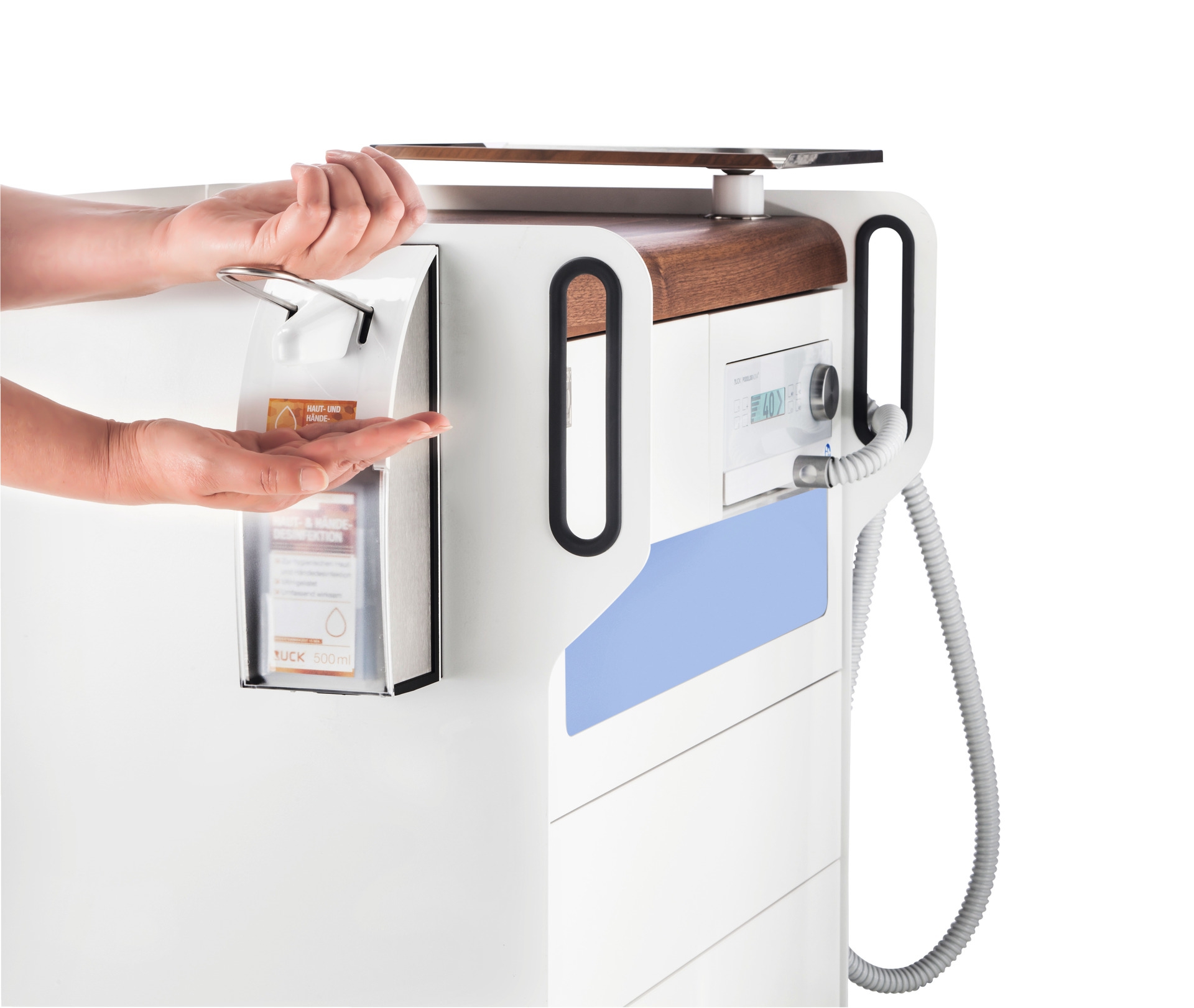 Für die berührungslose Entnahme von Desinfektionsmittel und Flüssigseife.