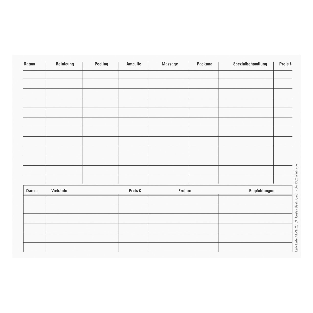 Die Analyse-Karten Kosmetik bieten eine übersichtliche Dokumentation und ermöglichen eine einfache Organisation von Terminen. Sie bieten außerdem Notizmöglichkeiten für Produktempfehlungen und mehr. Diese Karten sind beidseitig bedruckt und im DIN A5-Format erhältlich.