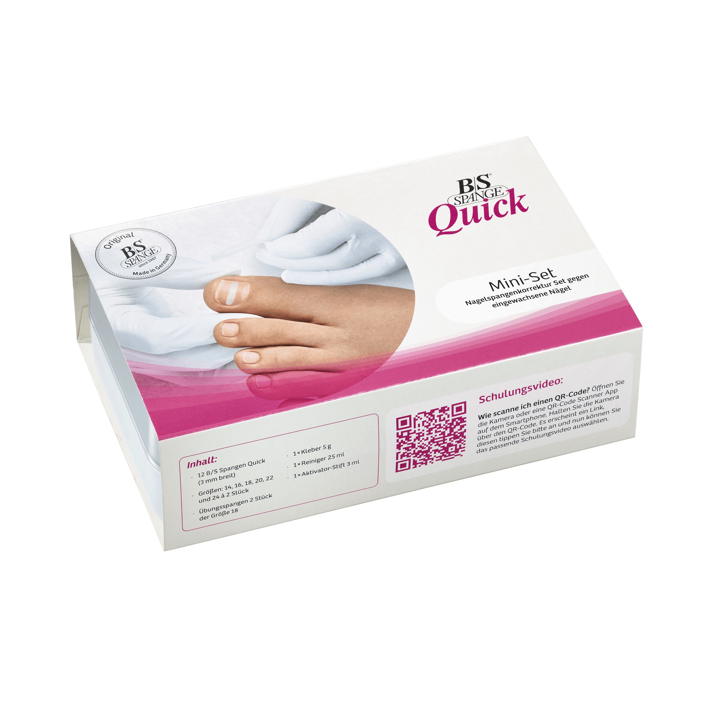 Das B/S Spangen Quick Mini-Set ist ein Komplettset zur Korrektur eingewachsener Nägel. Es enthält 20 B/S-Spangen Quick, die besonders leicht und schnell anzuwenden sind. Sie können einfach mit den Fingern appliziert werden, da sie auf einer Trägerfolie vorplatziert sind, die zugleich als Applikator fungiert.