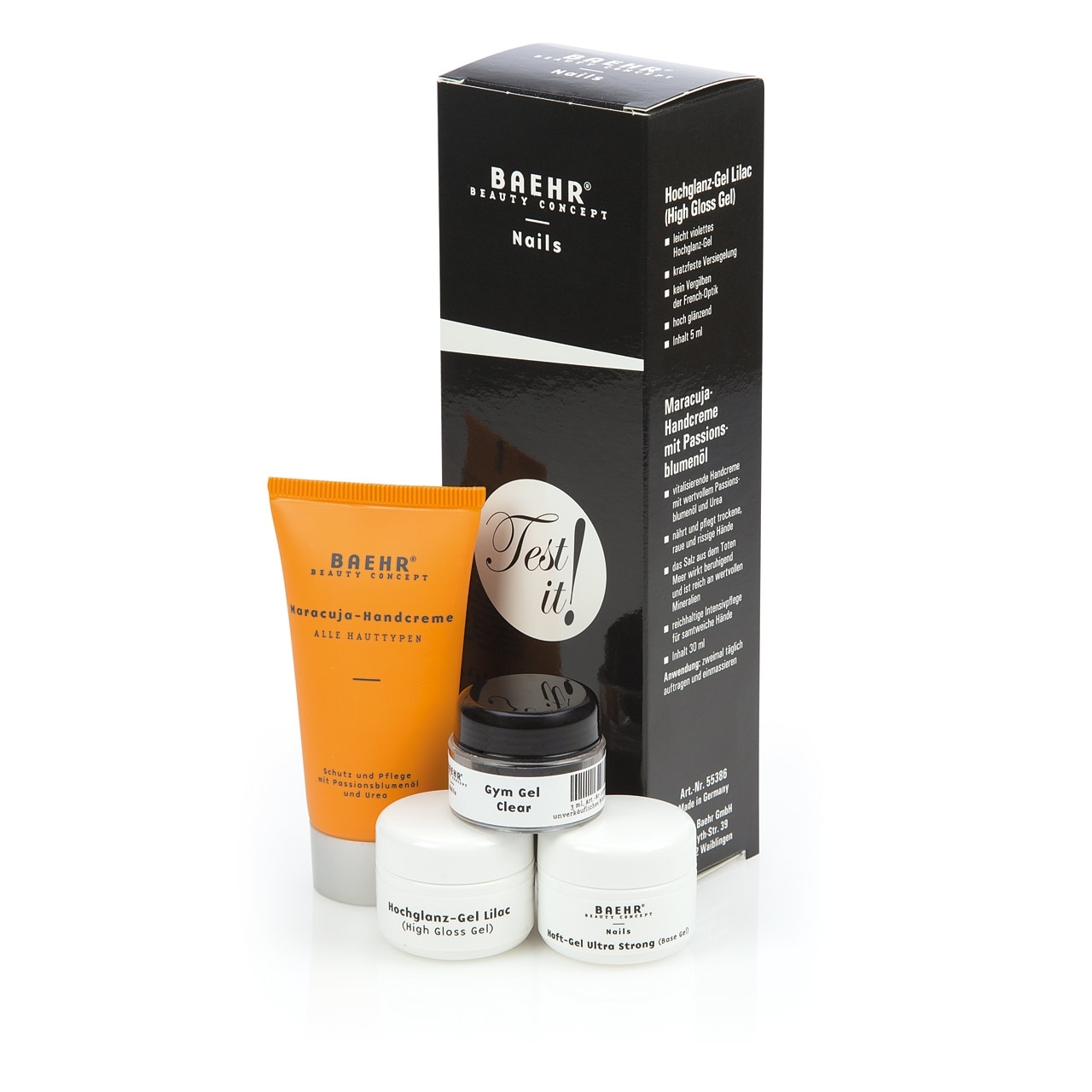 bestehend aus: 1 x Haft-Gel Ultra Strong (Base Gel), 5 ml 1 x Gym Gel Clear, 3 ml 1 x Hochglanz-Gel Lilac (High Gloss Gel), 5 ml 1 x Maracuja-Handcreme, 30 ml
