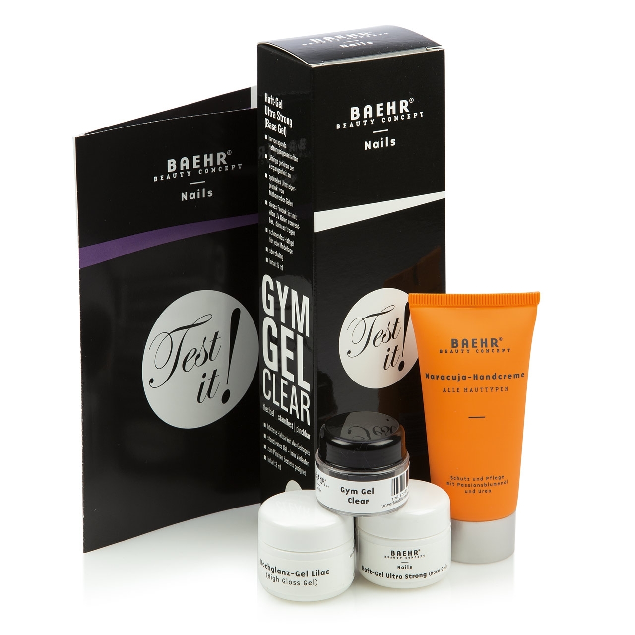 Gym Gel Clear Test-it-Boxbestehend aus:1 x Haft-Gel Ultra Strong (Base Gel), 5 ml1 x Gym Gel Clear, 3 ml1 x Hochglanz-Gel Lilac (High Gloss Gel), 5 ml1 x Maracuja-Handcreme, 30 ml Hinweis: Nur 1x pro Kunde bestellbar!
