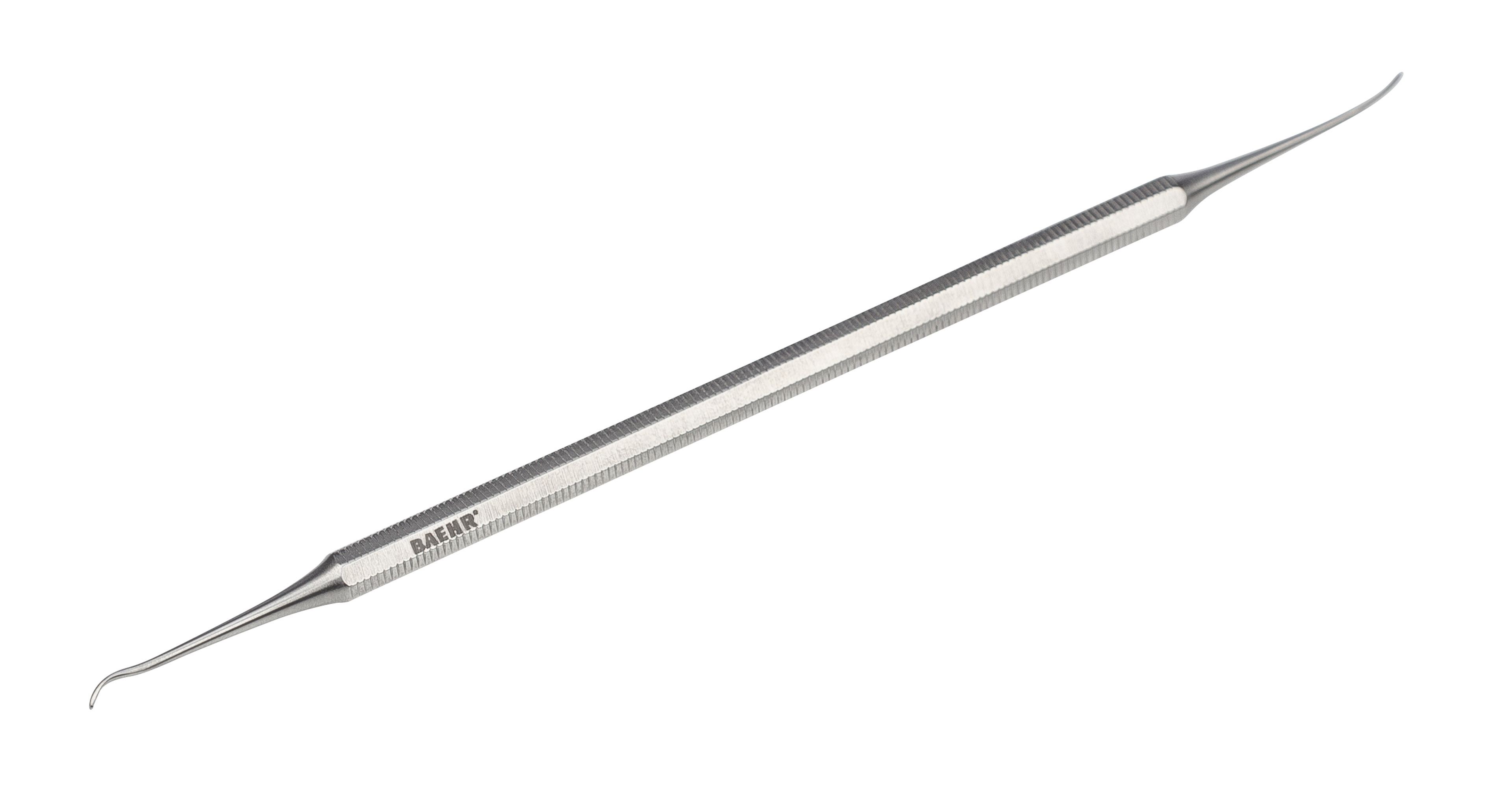 Doppelinstrument zum schonenden Arbeiten im Nagelfalz oder unter der Nagelplatte. Mit der leichter gebogenen anderen Seite lässt es sich randgenau arbeiten. Aus rostfreiem Edelstahl, desinfizier- und sterilisierbar.