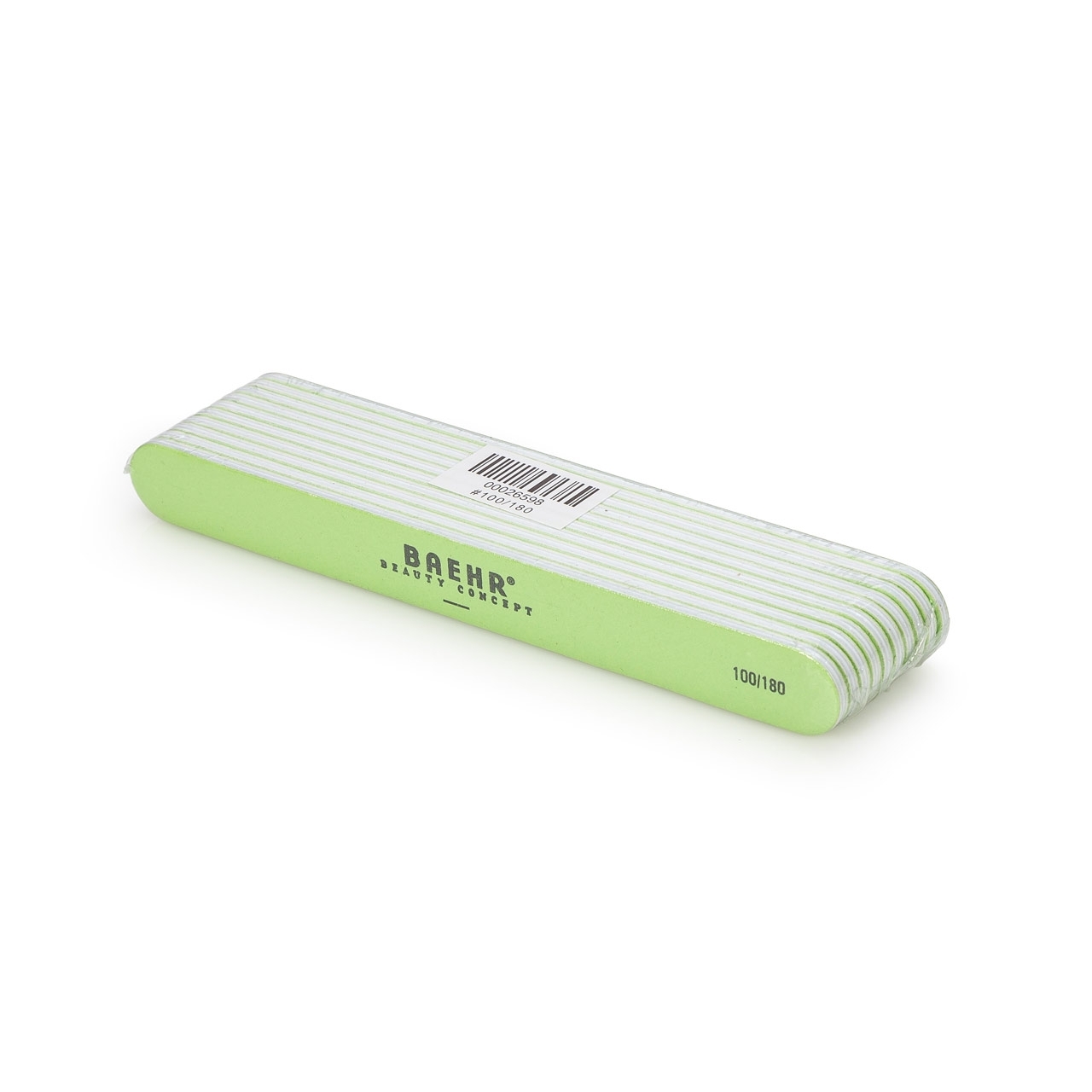 Die BAEHR Profifeile "MINT" Körnung 100/180 ist speziell für den professionellen Einsatz konzipiert. Sie ist robust, langlebig und bietet eine exzellente Leistung. Die Doppelseitige Körnung ermöglicht vielseitige Anwendungen. Mit einer groben Seite (Körnung 100) für schnelles Kürzen und einer feinen Seite (Körnung 180) für sanftes Feilen und Glätten der Nagelkante.