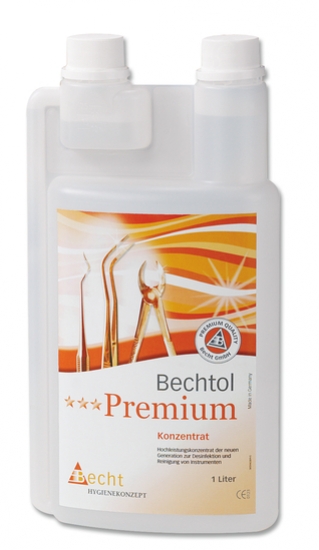 Das Bechtol Premium Konzentrat ist ein Hochleistungskonzentrat der neuen Generation zur Desinfektion und Reinigung von Instrumenten. Es wirkt bakterizid und fungizid in 15 Minuten in 2%iger Lösung und in 60 Minuten in 1%iger Lösung unter hoher organischer Belastung. Zudem gewährleistet es einen wirksamen Schutz gegen MRSA und M. terrae.