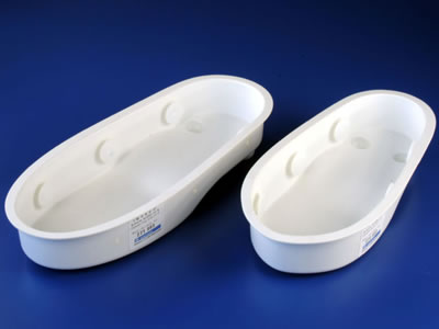 Schale mit Retentionsknöpfen. Länge 30 cm. Höhe 6 cm. Absatzsprengung 1 cm.AnwendungsbereichHochpräzise Abformung zur Herstellung von Leisten.HandhabungGrundschale wird je nach Größe des Fußes ausgewählt. Der Fuß wird in die Schale gestellt und anschließend Alginat Abformmasse in die Schale gegossen. Nach wenigen Minuten kann der Fuß entformt werden.