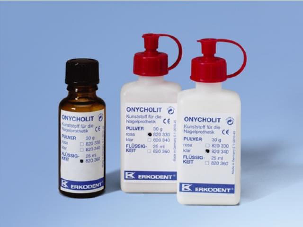 Die ONYCHOLIT Flüssigkeit ist ideal geeignet für das ERKODENT Onycholit Pulver klar/rosa. Die Kombination aus beiden erzeugt einen robusten und haltbaren Kunststoff, der sich optimal zur Herstellung von Modellnagelplatten und zur Befestigung von handelsüblichen Drahtspangen eignet.