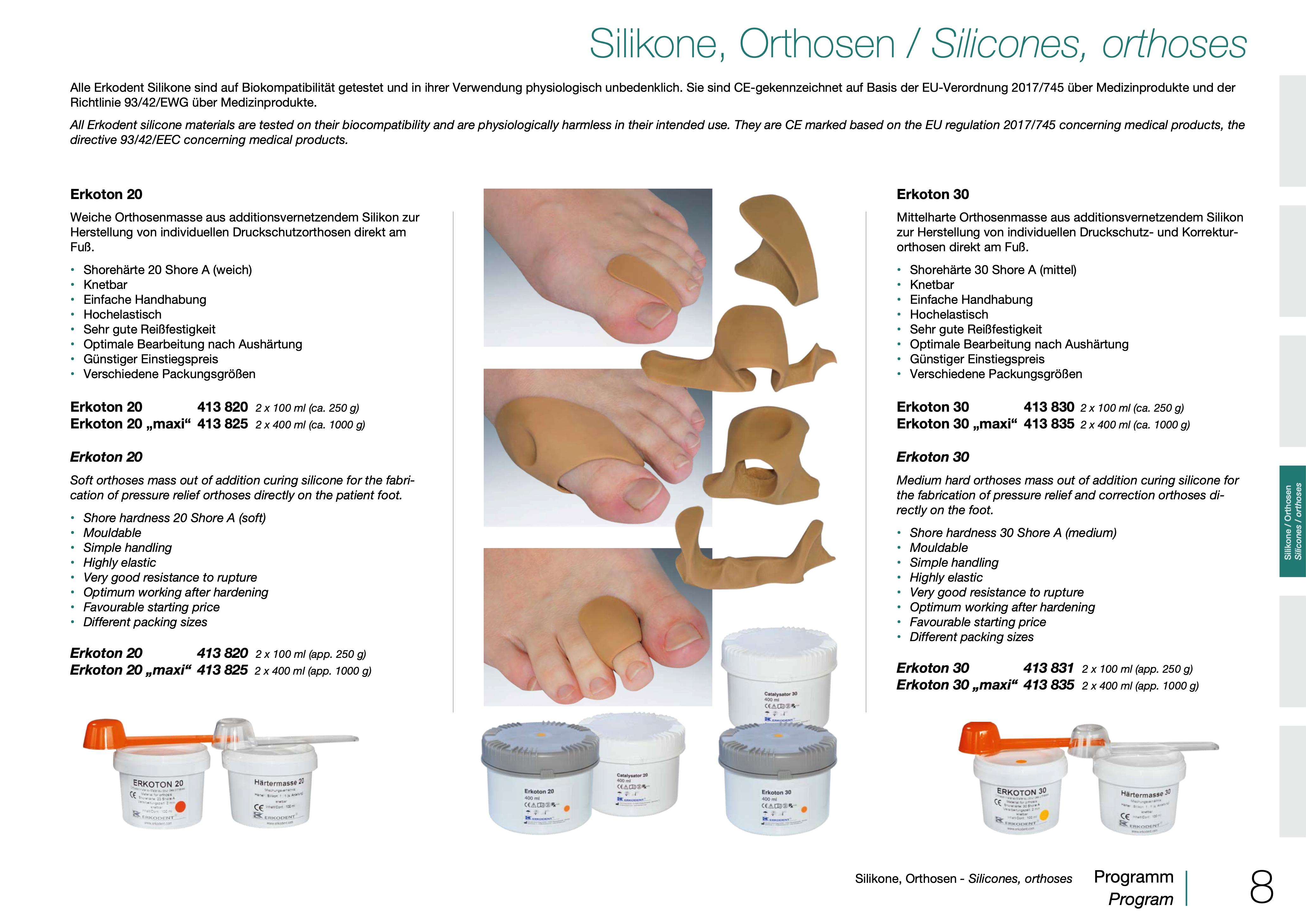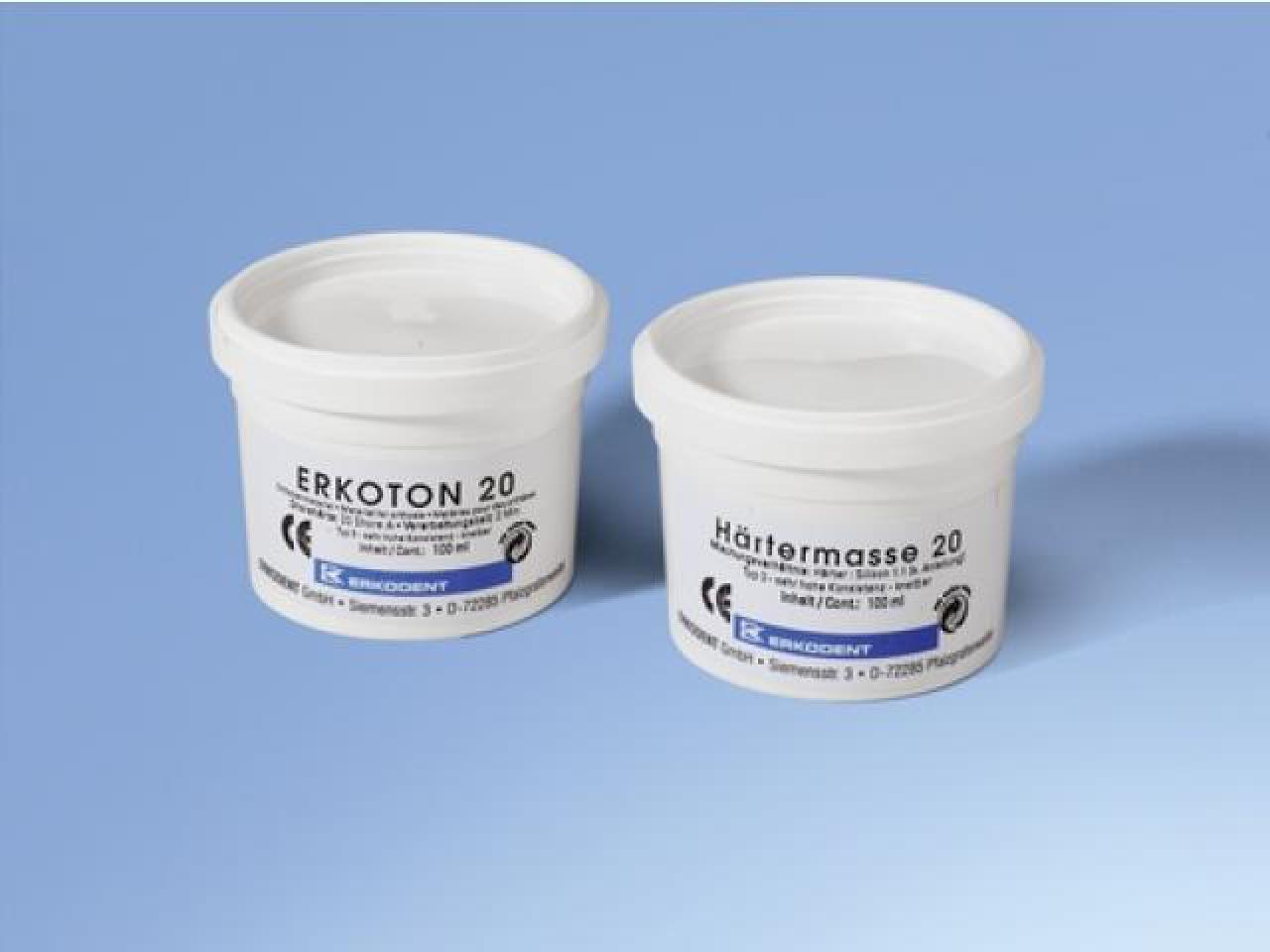 ERKODENT ERKOTON 20 ist eine weiche Orthosenmasse aus additionsvernetzendem Silikon mit einer Shorehärte von 20 Shore A (weich). Sie ist knetbar und einfach in der Handhabung. Die Masse eignet sich zur Herstellung von individuellen Druckschutzorthosen direkt am Fuß. Sie ist hochelastisch, besitzt eine sehr gute Reißfestigkeit und lässt sich optimal bearbeiten, nachdem sie ausgehärtet ist. Das Produkt ist als Medizinprodukt der Klasse 1 eingestuft und in verschiedenen Packungsgrößen erhältlich.
