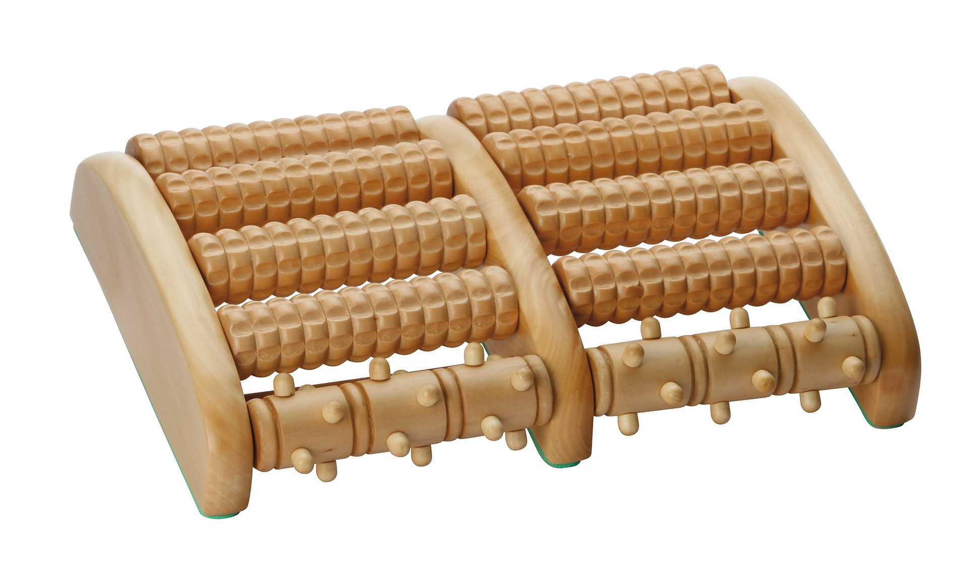 Der Fußmassageroller in anatomisch gewölbter Form ist aus echtem Holz gefertigt und mit angenehmen Kunststoffnoppen versehen. Mit insgesamt 5 Rollen auf jeder Seite ermöglicht er ein äußerst effektives und tiefenwirksames Training des kompletten Fußgewölbes.