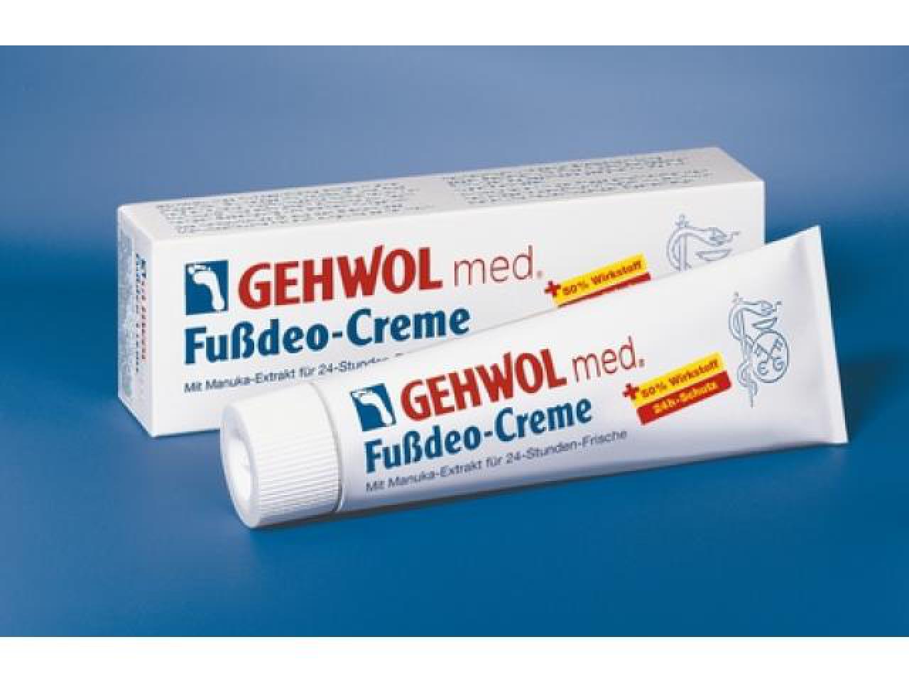 GEHWOL med Fußdeo-Creme mit neuem, angenehmem Duft kombiniert den hochkonzentrierten Wirkstoffextrakt des Manuka-Öls mit Zinkoxid zur Beseitigung von starkem Fußgeruch für mindestens 24 Stunden in einer pflegenden Cremegrundlage mit Jojoba-Öl und Aloe Vera. Der erstmalig in der Fußpflege eingesetzte Extrakt enthält alle Wirkkomponenten des bekannten Manuka-Öls und eignet sich durch die ausgezeichnete Wirkung gegen Bakterien und Pilze besonders für die Fußhygiene. Zinkoxid in hochwirksamer mikronisierter Form ist ein in der Pflege empfindlicher Haut hervorragend bewährter Wirkstoff mit antimikrobiellen und hautschützenden Eigenschaften. Aloe Vera wirkt bakteriostatisch, entzündungshemmend, regenerierend und feuchtigkeitsspendend. Jojoba-Öl wird als natürliches, flüssiges Wachs schnell von der Haut aufgenommen. Es enthält wertvolle, mehrfach ungesättigte Fettsäuren und unterstützt die natürlichen Hautfunktionen. Die mild-fettende Creme sorgt bei regelmäßiger Anwendung für geruchlose Füße, geschmeidige Haut und Schutz vor Fußpilz.