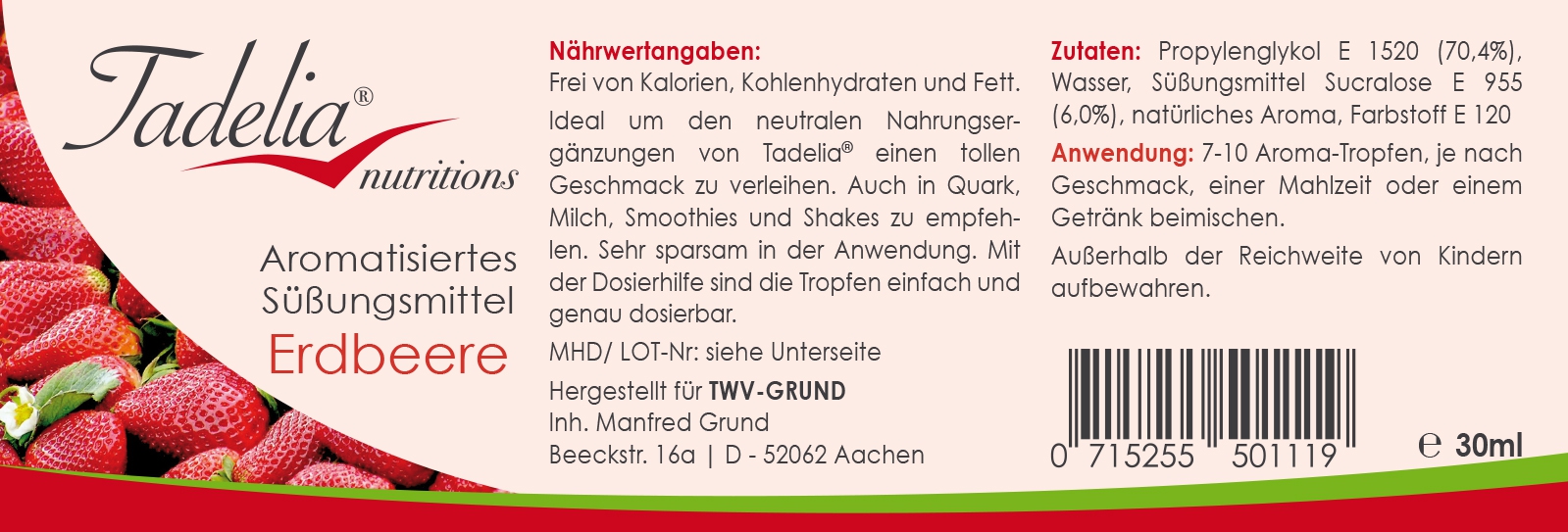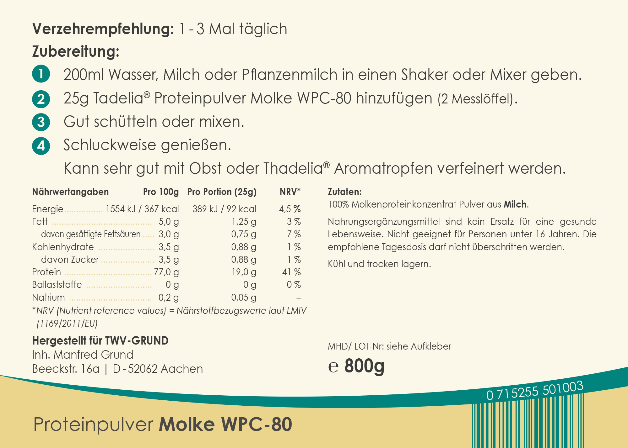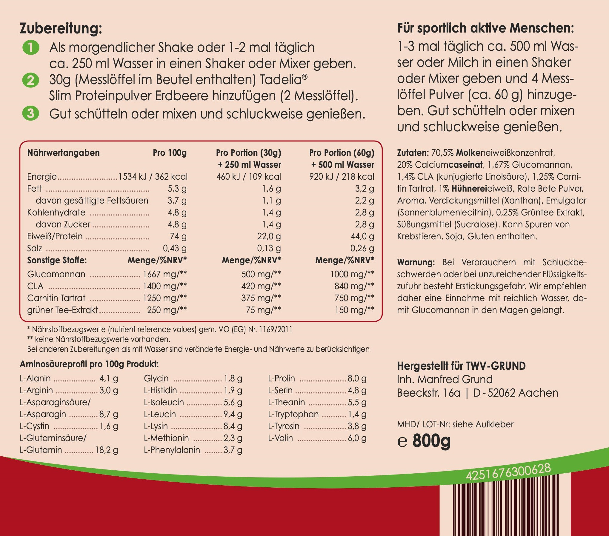 1 Beutel Proteinpulver (standard: Tadelia® Proteinpulver Molke WPC 80 - 800g) Erdbeere, Schoko, Rohkost |