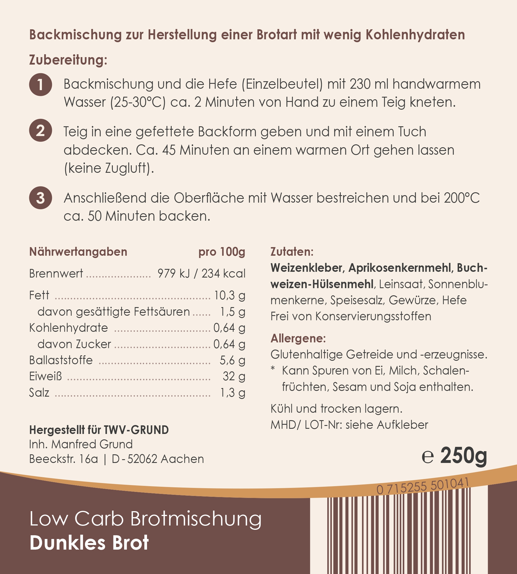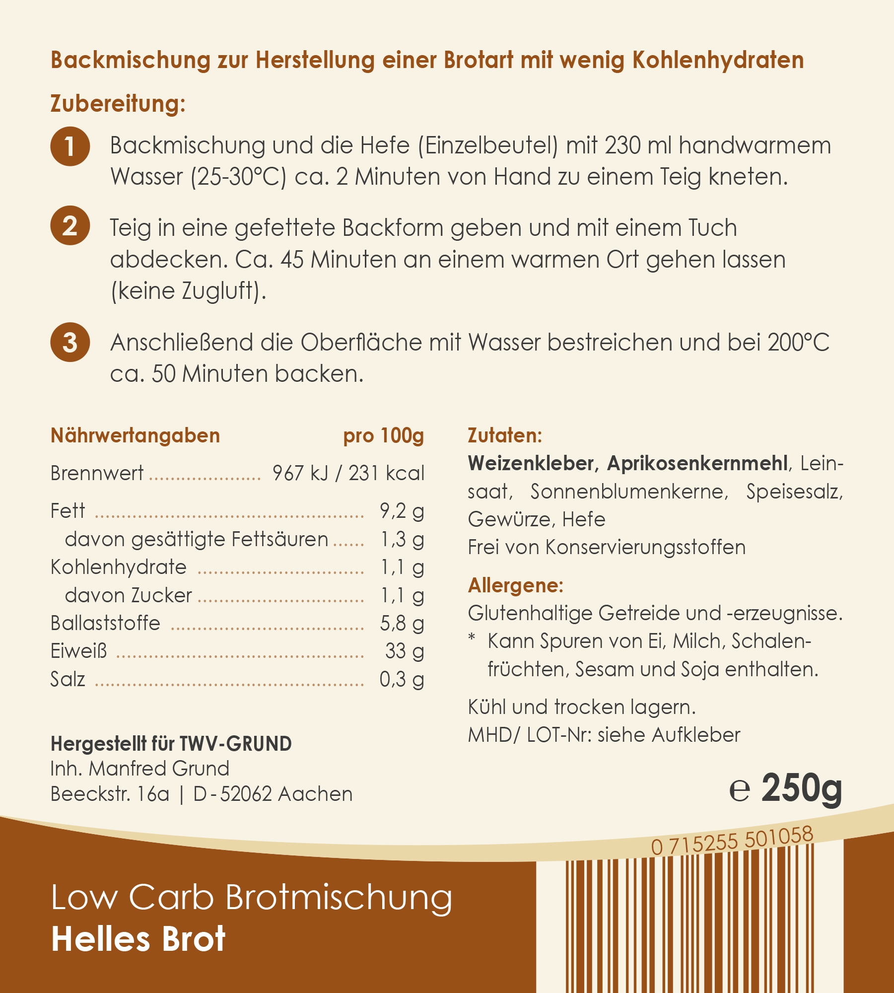 1 Beutel Tadelia® Low Carb Brot 250 g | entsprechende Auswahl siehe oben |