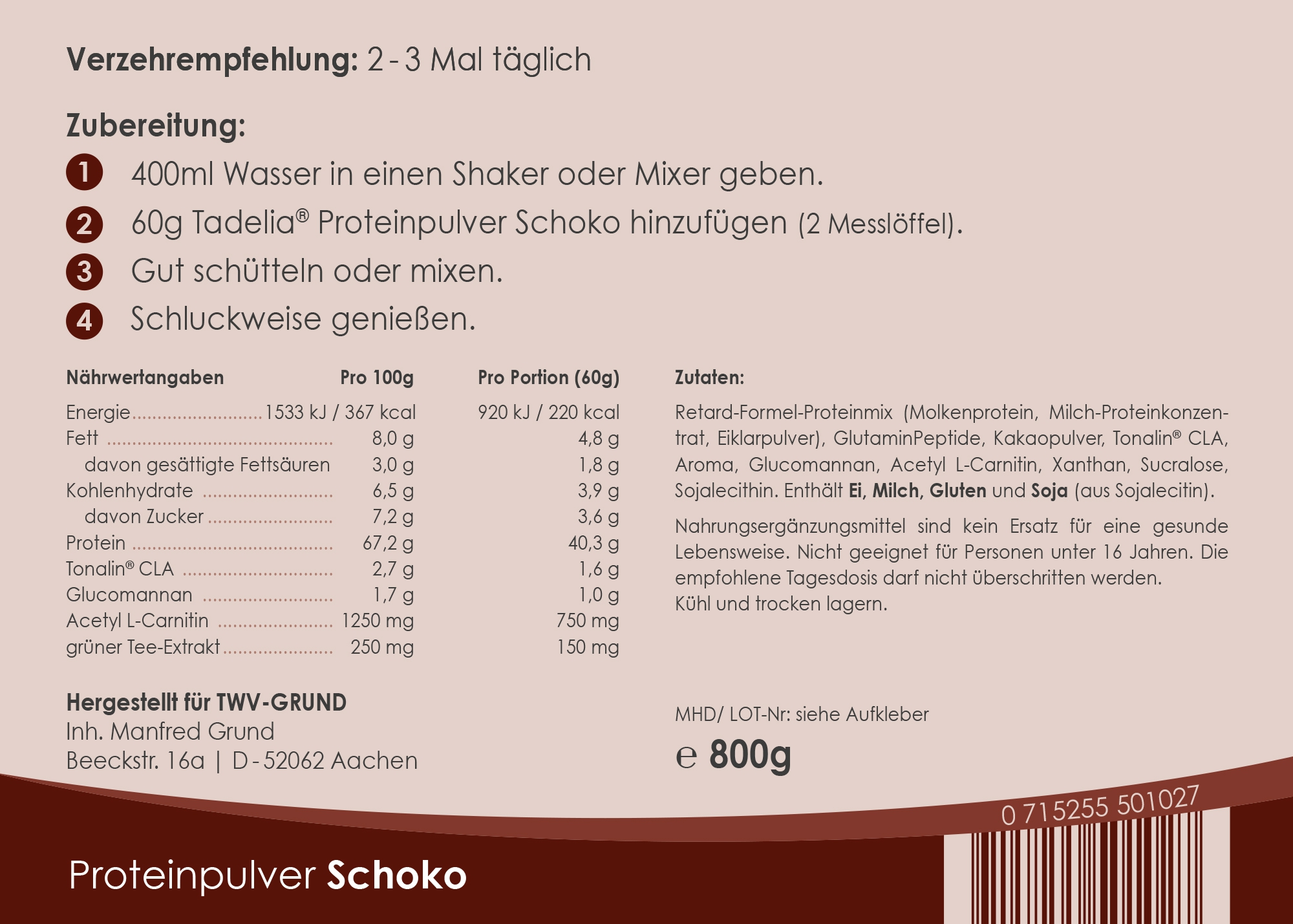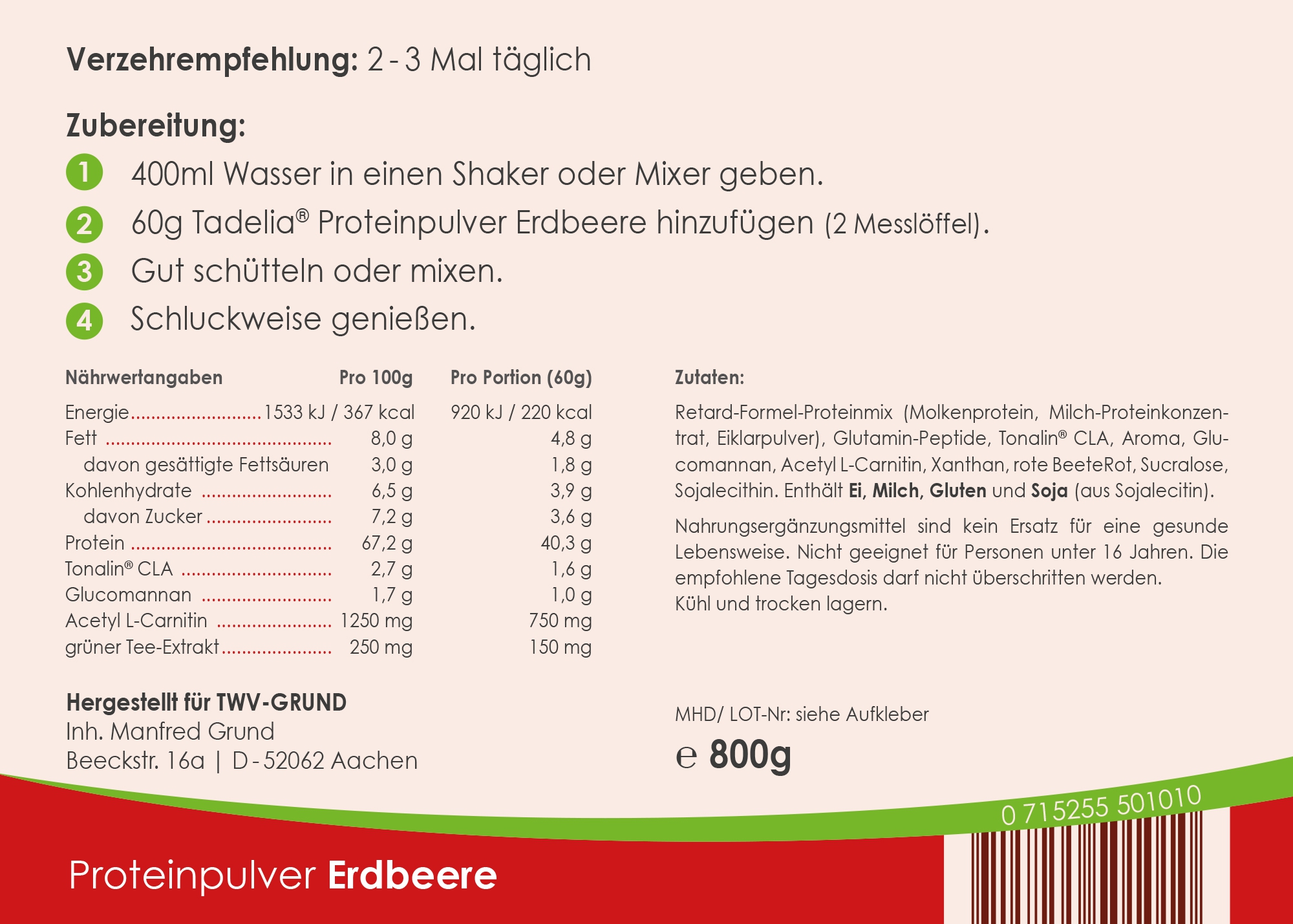 1 Beutel Proteinpulver (standard: Tadelia® Proteinpulver Molke WPC 80 - 800g) Erdbeere, Schoko |