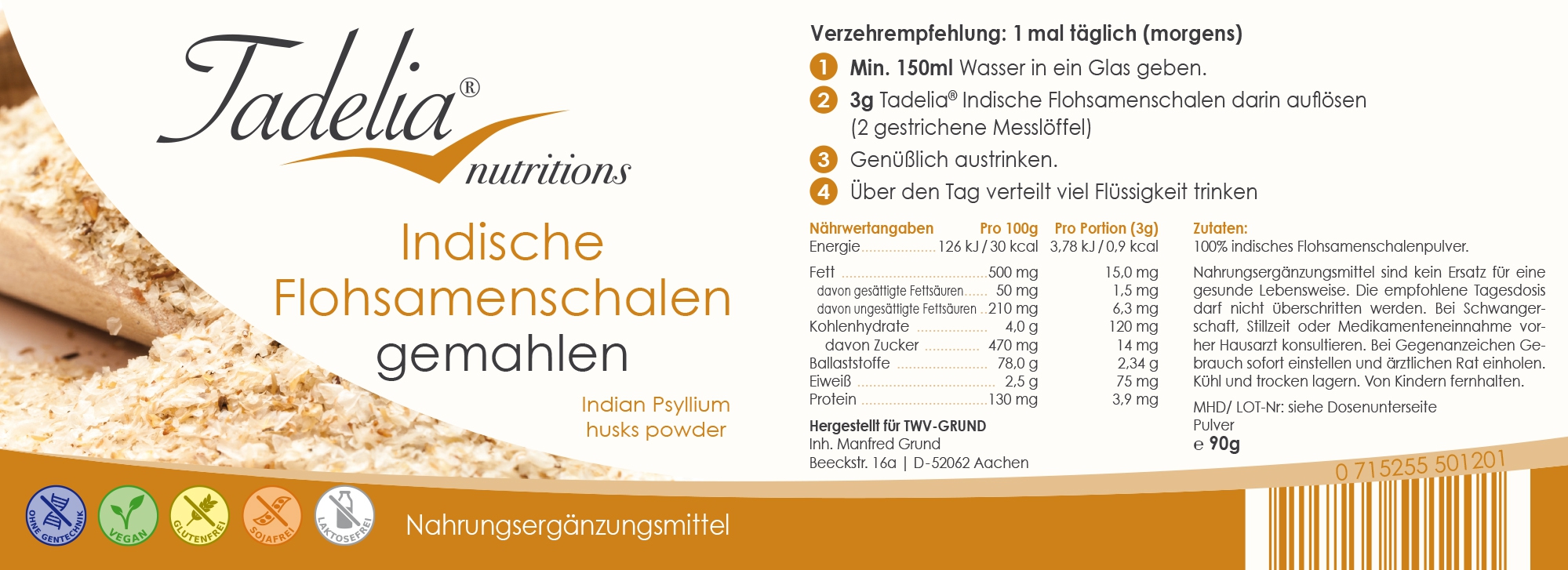 Tadelia® Indische Flohsamenschalen gemahlen ist ein Nahrungsergänzungsmittel, bestehend zu 100 % aus ganzen Flohsamenschalen.