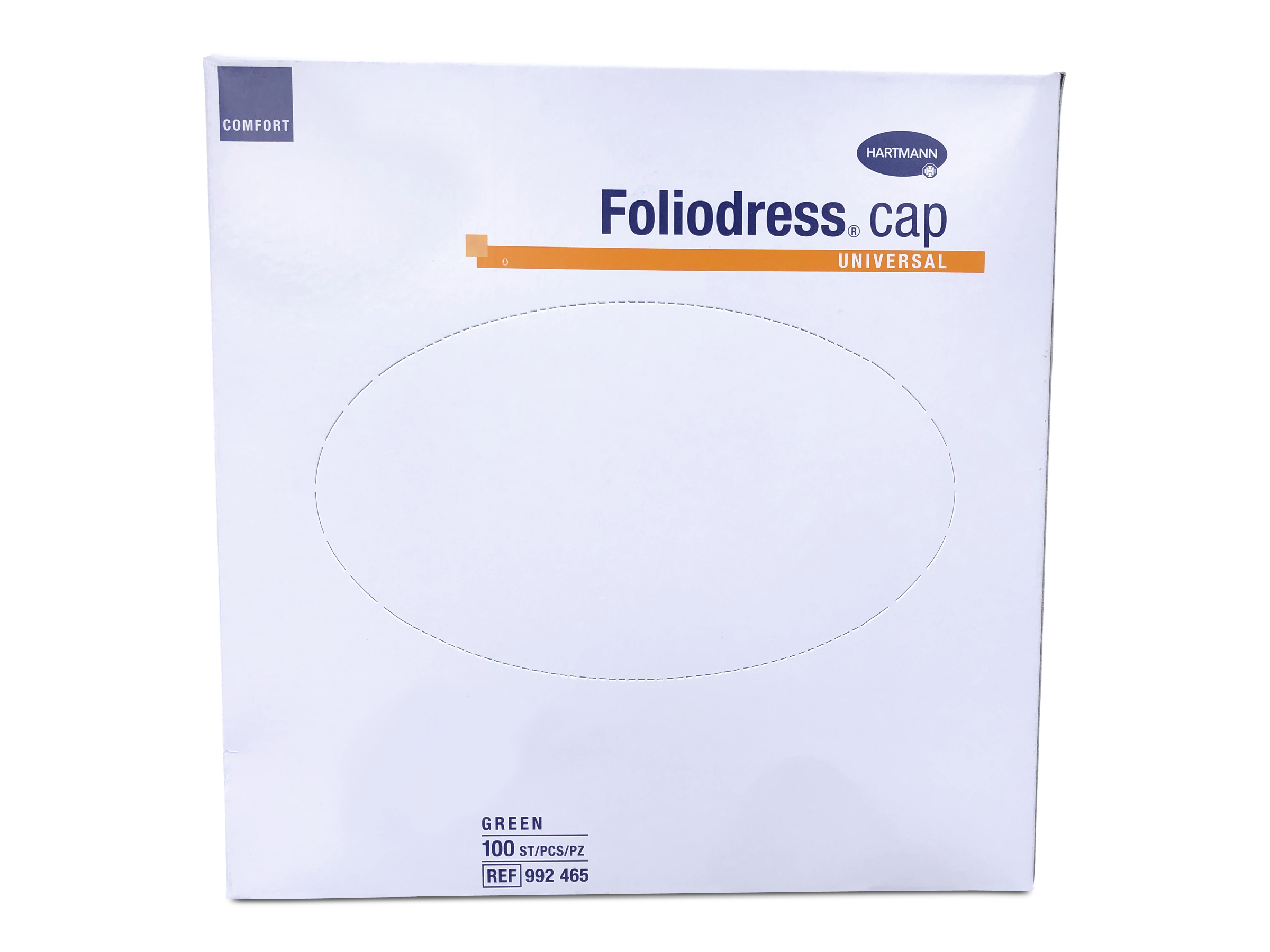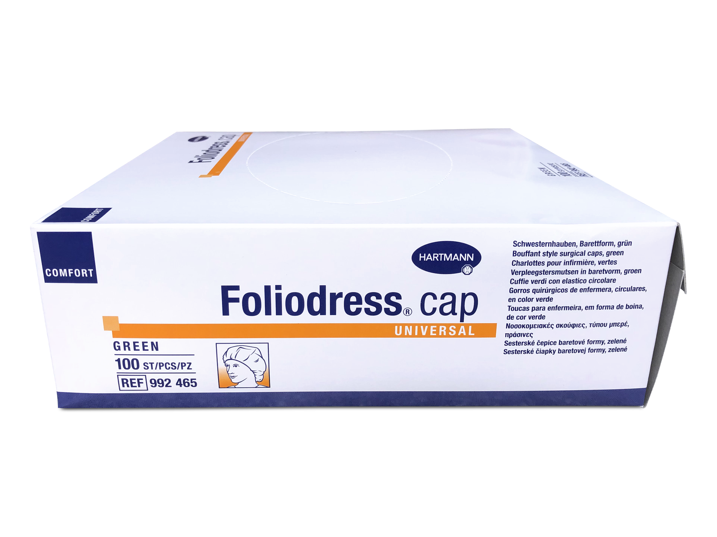 Die Hartmann Foliodress Cap Comfort ist eine universelle Baretthaube, die aus einem atmungsaktiven, weichen Vliesstoff mit Gummizug gefertigt ist. Sie ist besonders leicht und angenehm zu tragen und frei von Naturlatex. Mit ihrem optimierten, längerem und weicherem Gummizug bietet sie einen hohen Tragekomfort. Die Kopfhauben sind in der Farbe Grün erhältlich und bestehen aus Viskose.