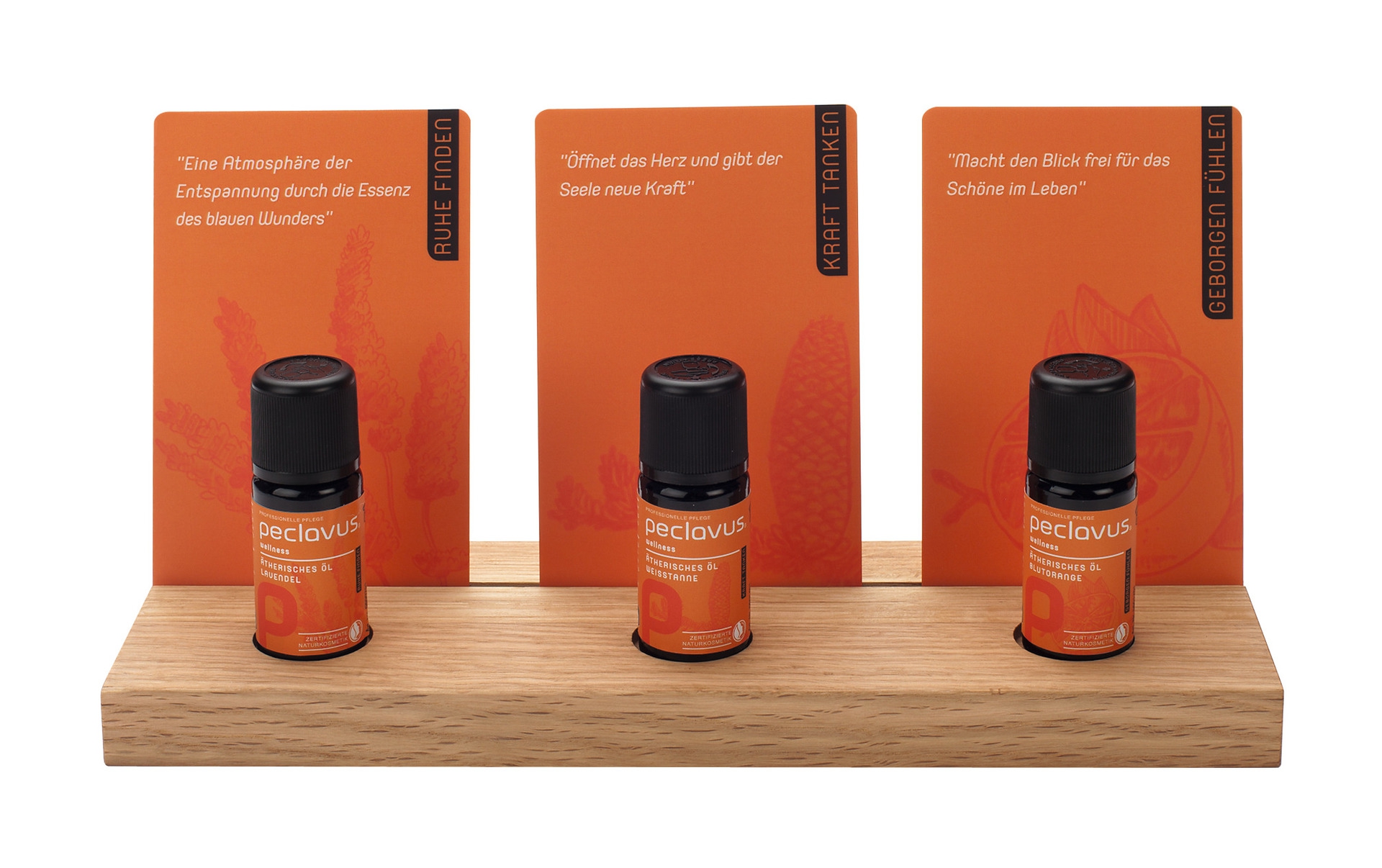 Das Peclavus Holzpodest besitzt auf einer Seite Aussparungen für drei Flakons, in die peclavus® wellness Massageöle abgefüllt werden können. In der Nut dahinter lassen sich die passenden Dufterlebniskarten platzieren. So kann jeder Kunde individuell nach seinem Empfinden in eine Stimmungswelt eintauchen und "sein" Massageöl schon vor der Behandlung wählen.