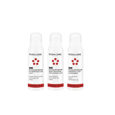 Alle drei SÜDA CARE Schaumcremes aus der Pflegelinie EVERYDAY sind frei von Silikonen, Parabenen und PEGs, vegan, dermatologisch getestet und werden für Diabetiker empfohlen. Sie haben kein Irritationspotenzial und sind sehr ergiebig.