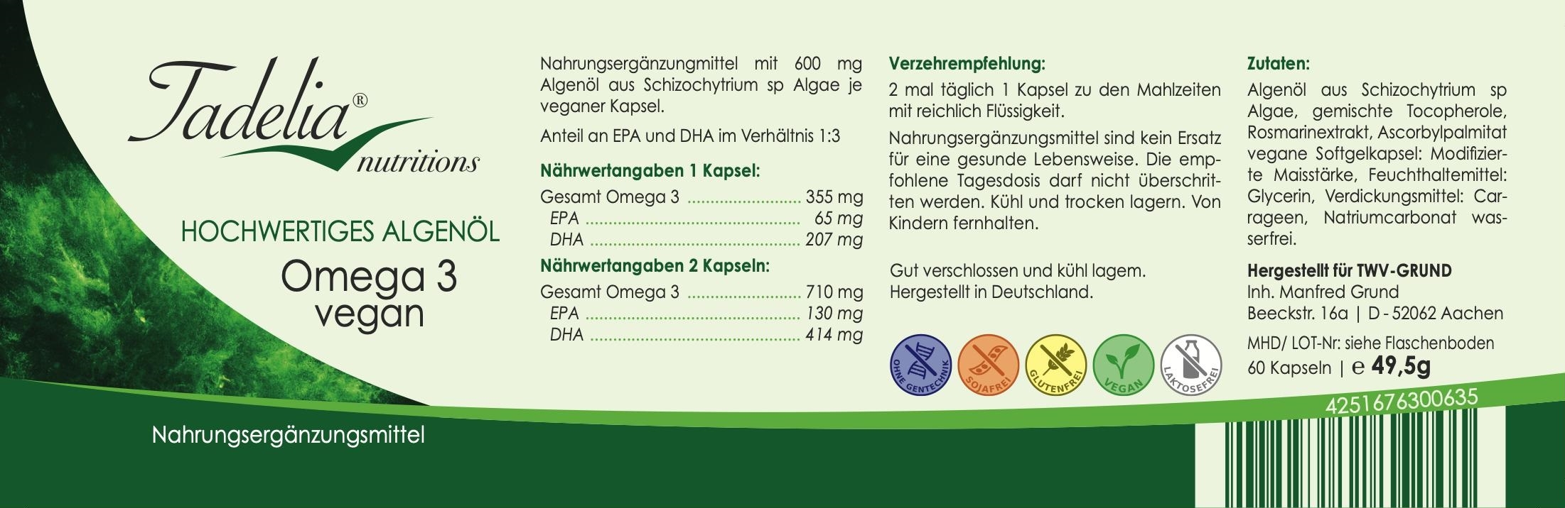 Produktinformationen "Tadelia® Omega 3 vegan hochwertiges Algenöl 60 Kapseln | 49,5 g"
