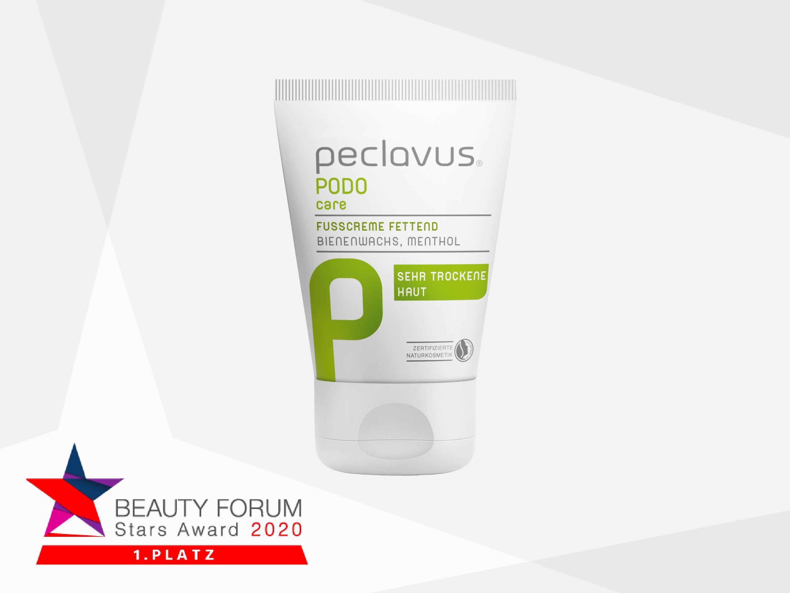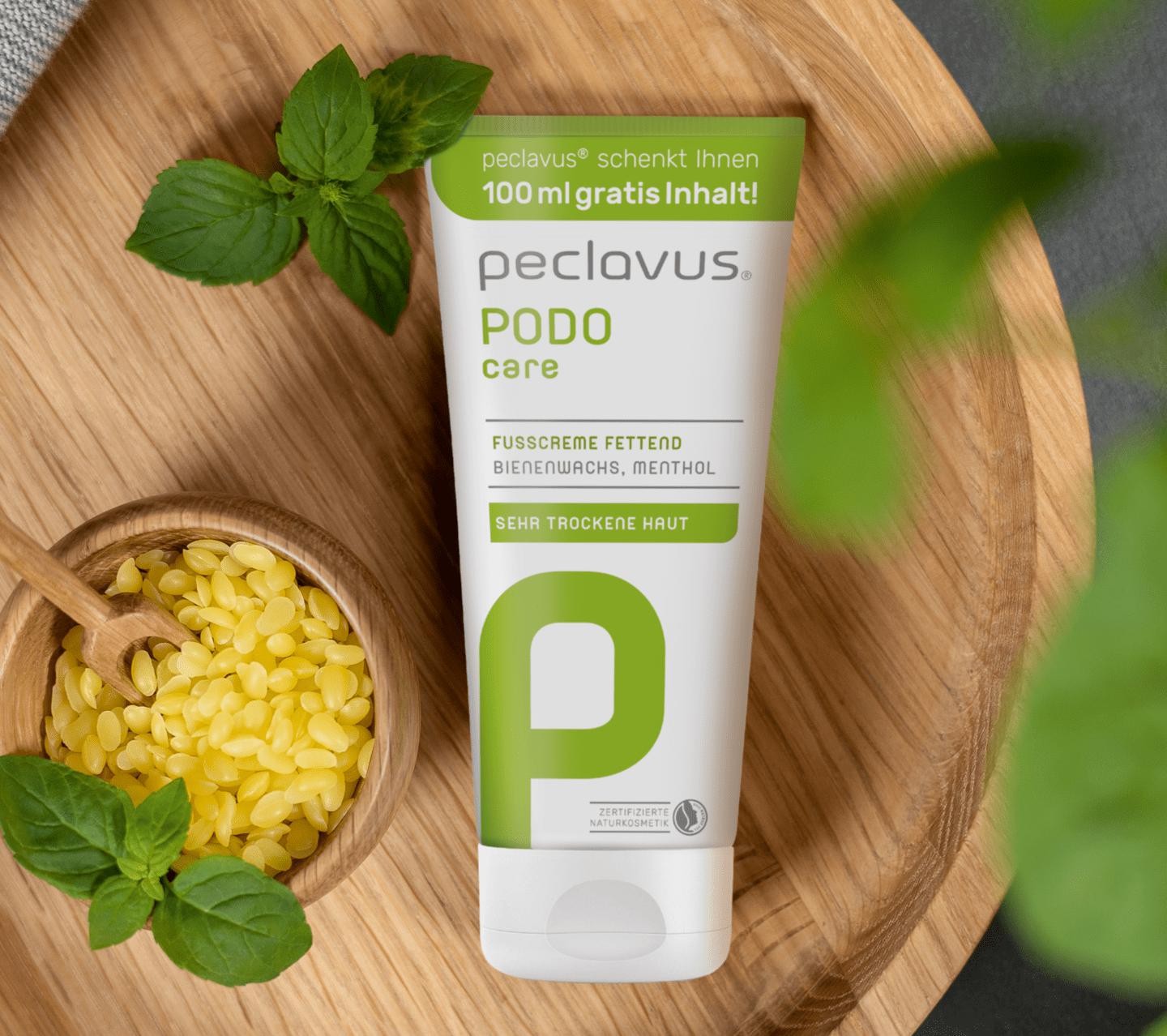 Die Peclavus PODOcare Fußcreme fettend bietet intensive Pflege für rissige und sehr trockene Füße. Sie beinhaltet nährendes Bienenwachs und einen antibakteriellen Wirkstoffkomplex aus Menthol und Kampfer, die eine solide Schutzbarriere bilden und zu einem elastischen Hautbild beitragen. Diese Fußcreme ist seit Jahrzehnten bewährt und in der Praxis erprobt. Als zertifizierte Naturkosmetik enthält sie keine Paraffinöle und ist NATRUE-zertifiziert.