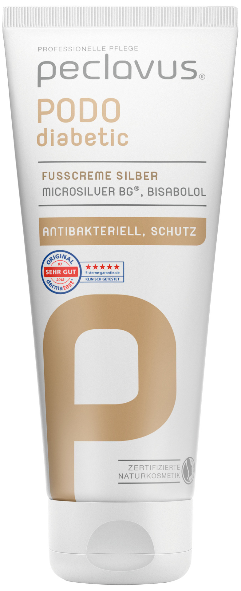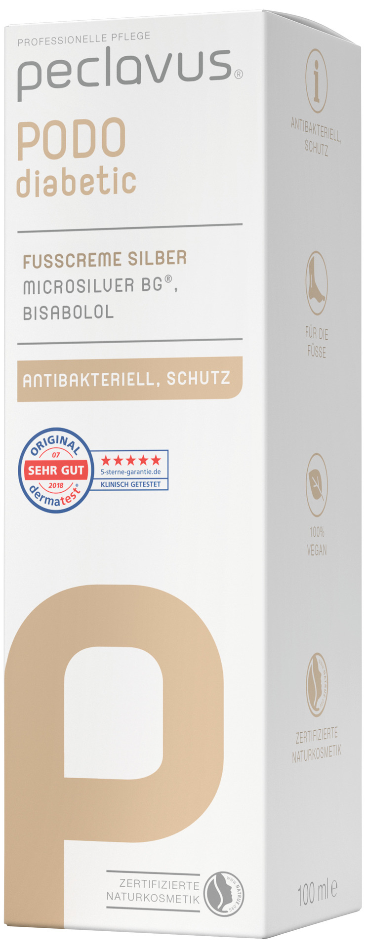 Die peclavus® PODOdiabetic Fußcreme Silber ist eine besonders sanfte Pflege für sensible Füße. Durch die erprobte Formel mit antibakteriell wirkendem MicroSilver BG® und Bisabolol wird die anfällige, diabetische Haut vor schädlichen Keimen und Entzündungen geschützt. Wertvolle Öle pflegen die Haut spürbar – auch für neurodermitische Haut geeignet. Ohne synthetische Duft-, Konservierungs- und Farbstoffe. Hautverträglichkeit klinisch getestet.