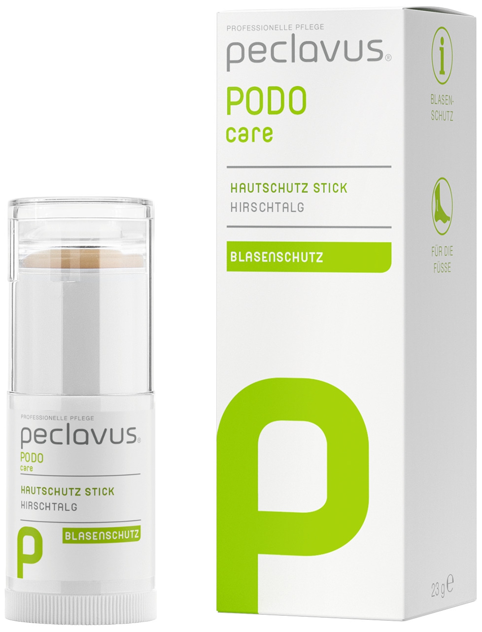 Der peclavus® PODOcare Hautschutz Stick ist ideal für die gezielte Vorbeugung gegen Blasen und Schwielen bei besonderer Beanspruchung, wie z. B. beim Wandern oder anderer sportlicher Betätigung. Der bewährte Wirkstoff Hirschtalg schützt die Haut über viele Stunden vor Wundscheuern im Schuh und beugt übermäßiger Hornhautbildung vor. Der Schutz ist abriebfest und auch im Wasser oder bei schwitzenden Füßen gewährleistet. Die natürliche Feuchtigkeitsregulierung wird dabei nicht beeinflusst. Durch seinen angenehmen Duft, die einfache, gezielte und sparsame Anwendung ist der Stick ein beliebtes Verkaufsprodukt.