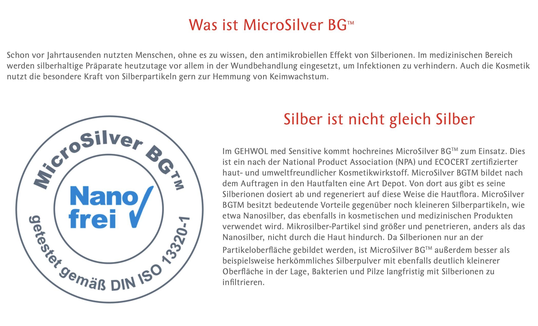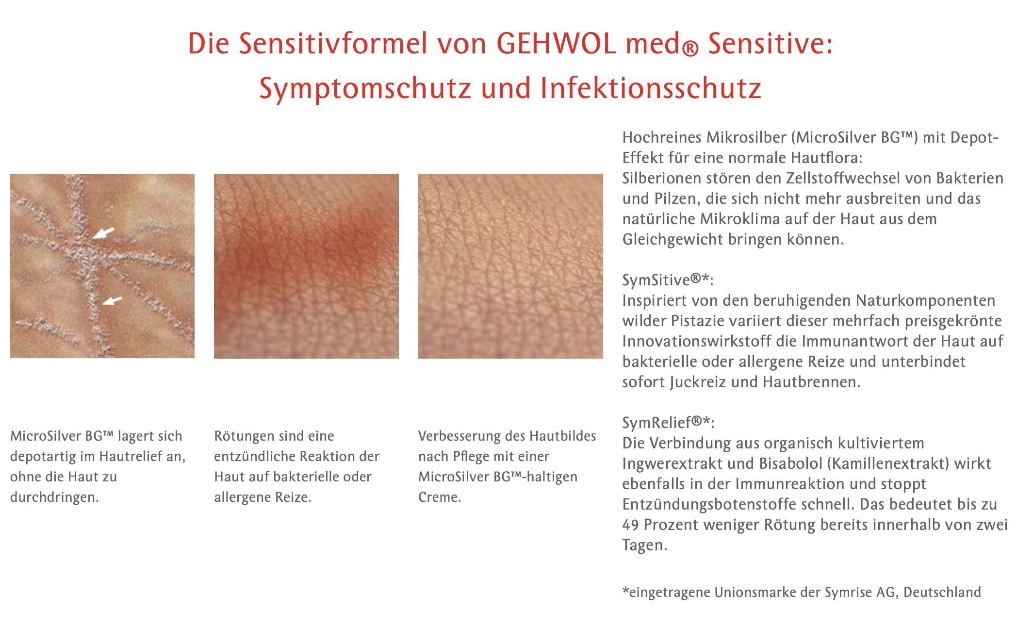 GEHWOL med Sensitive wurde speziell für die Bedürfnisse empfindlicher und trockener Haut entwickelt. Sie regeneriert die natürliche Mikroflora der Haut, lindert Juckreiz und Hautbrennen, reduziert Rötungen und schützt vor Infektionen. In der Creme-Formulierung wurde hochreines Mikrosilber (MicroSilver BG™) eingearbeitet. Das nano-freie Mikrosilber bildet ein Depot in den Hautfalten und gibt die Silberionen dosiert ab. Die Silberionen stören den Zellstoffwechsel von Bakterien und Pilzen. So können sich diese nicht mehr ausbreiten und das natürliche Mikroklima auf der Haut aus dem Gleichgewicht bringen. Darüber hinaus stabilisieren Ceramide die natürliche Hautbarriere. Pflegendes Mandelöl hält die Haut weich und geschmeidig. Auch bei Neurodermitis sowie Fuß- und Nagelpilz GEHWOL med Sensitive therapiebegleitend eingesetzt werden.
