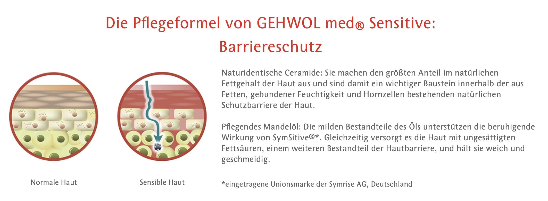 GEHWOL med Sensitive wurde speziell für die Bedürfnisse empfindlicher und trockener Haut entwickelt. Sie regeneriert die natürliche Mikroflora der Haut, lindert Juckreiz und Hautbrennen, reduziert Rötungen und schützt vor Infektionen. In der Creme-Formulierung wurde hochreines Mikrosilber (MicroSilver BG™) eingearbeitet. Das nano-freie Mikrosilber bildet ein Depot in den Hautfalten und gibt die Silberionen dosiert ab. Die Silberionen stören den Zellstoffwechsel von Bakterien und Pilzen. So können sich diese nicht mehr ausbreiten und das natürliche Mikroklima auf der Haut aus dem Gleichgewicht bringen. Darüber hinaus stabilisieren Ceramide die natürliche Hautbarriere. Pflegendes Mandelöl hält die Haut weich und geschmeidig. Auch bei Neurodermitis sowie Fuß- und Nagelpilz GEHWOL med Sensitive therapiebegleitend eingesetzt werden.
