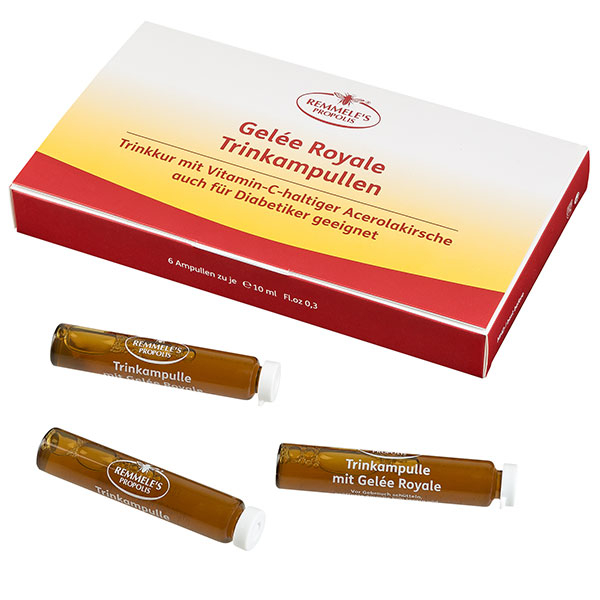 Wer auf sein Wohlbefinden achtet und seiner Leistungsfähigkeit einen Schub geben möchte, gönnt sich gerne täglich etwas Gutes. Gelée Royale Trinkampullen gehören unbedingt dazu. Ebenso wie Propolis, Honig und Blütenpollen gehört Gelee Royal zu den Schätzen der Imkerei. Es enthält unter anderen Vitaminen besonders viele natürliche B-Vitamine, Aminosäuren in einer äußerst günstigen Kombination sowie wertvolle Mineralstoffe. So ist die Wirkung der Gelée Royale Trinkampullen von Remmele's Propolis vergleichbar mit einer Körperpflege von innen. Unterstützt wird dies durch das Extrakt der Acerola-Kirsche, die reich an Vitaminen, besonders Vitamin C, ist. Dabei enthalten die Ampullen keinen Alkohol, sind aber leichter einzunehmen als Kapseln. Somit sind Remmele’s Propolis Gelée Royale Trinkampullen eine perfekte Nahrungsergänzung und der Inhalt wird vom menschlichen Organismus gut aufgenommen. Wie für alle Kosmetik-Produkte und Nahrungsergänzungsmittel, die Sie auf der Startseite von Remmele's finden, gelten auch hier höchste Qualitätsstandards.