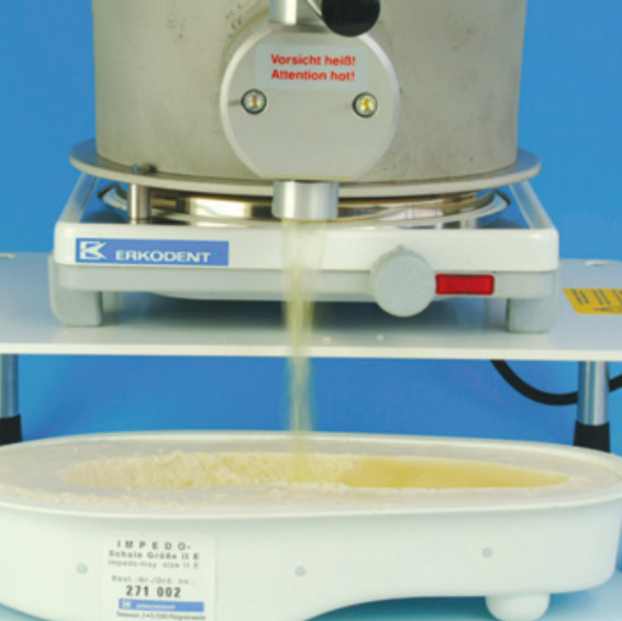 Revo-Gel in Schmelztopf auf 165 Grad erhitzen und durch den Auslaßhahn des Schmelztopfes in Negativform eingießen. Überschüssiges Material oder nicht mehr benötigte Rohlinge wieder zurück in den Schmelztopf. Revo-Gel kann wiederverwendet werden.