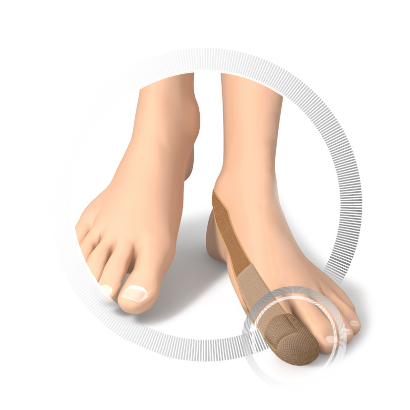 1. Großzehenkappe überziehen, mit Klett/Flauschzügel zur Fußinnenseite liegend.