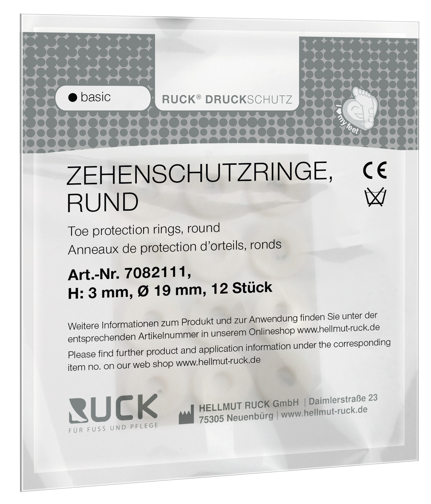 Die RUCK DRUCKSCHUTZ basic Zehenschutzringe sind rund und weisen eine Höhe und einen Durchmesser von 3 bzw. 19 mm auf. Sie kommen in einer Verpackungseinheit von 12 Stück und sind einfach anzuwenden. Einfach den Ring über den Zeh ziehen und schon ist der Zeh geschützt. Durch ihr minimalistisches Design fallen sie kaum auf und können problemlos in jedem Schuh getragen werden.