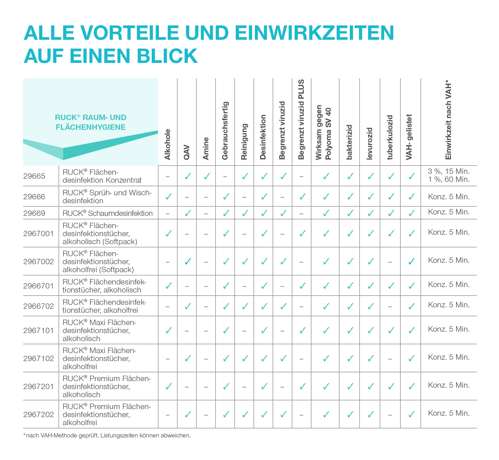 Die Einwirkzeiten sind beeindruckend kurz. Bei Bakterien nach EN 13727 und EN 13697 (hohe Belastung) beträgt die Konzentration lediglich 1 Minute. Gleiches gilt für Candida albicans nach EN 13624 und EN 13697 (hohe Belastung), behüllte Viren (z.B. HBV, HIV, HCV) gemäß RKI/DVV, hohe Belastung, und Rota-Viren nach RKI/DVV mit Belastung. Bei Noro-Viren nach EN 14476 (niedrige Belastung) beträgt die Konzentration 30 Minuten. Die Wirksamkeit der getränkten Tücher nach EN 16615 und VAH (hohe Belastung) ist nach 1 Minute gegeben. Die Tränkflüssigkeit wirkt gegen Bakterien und Candida albicans innerhalb von 5 Minuten (kürzeste Einwirkzeit für Flächendesinfektionsmittel in VAH-Liste).