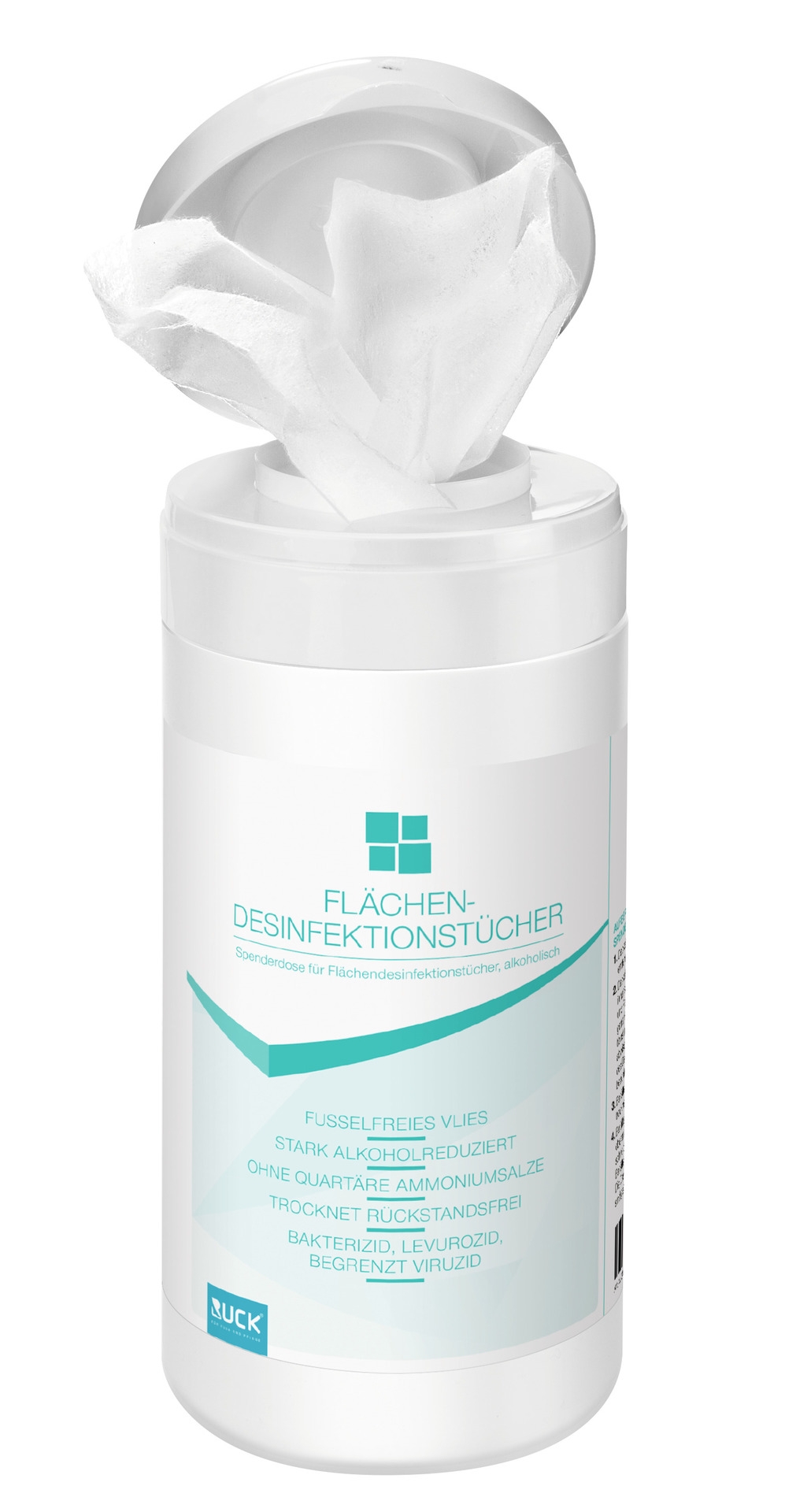 RUCK Flächendesinfektionstücher alkoholisch sind gebrauchsfertige, alkoholische Feuchttücher, die speziell zur Desinfektion von alkoholbeständigen, kleinen Flächen entwickelt wurden. Sie bieten sehr hohe Materialverträglichkeit und sind daher besonders schonend zu behandelnden Flächen. Mit ihrer praktischen Größe und Flexibilität sind sie optimal geeignet für die Desinfektion kleiner, verwinkelter Flächen.