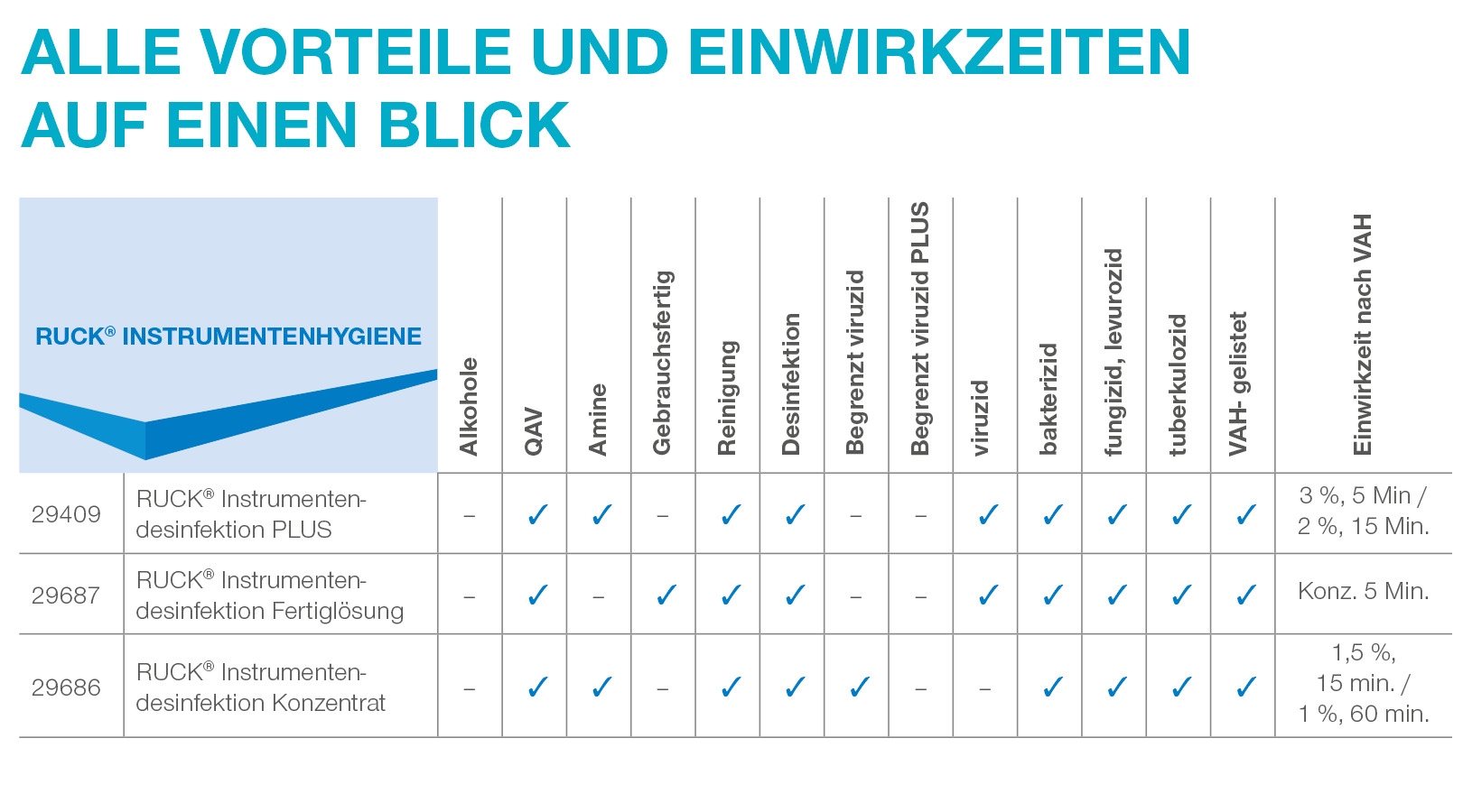 - breites Wirkungsspektrum (aldehydfrei, peressigsäurefrei, chloroxidfrei)