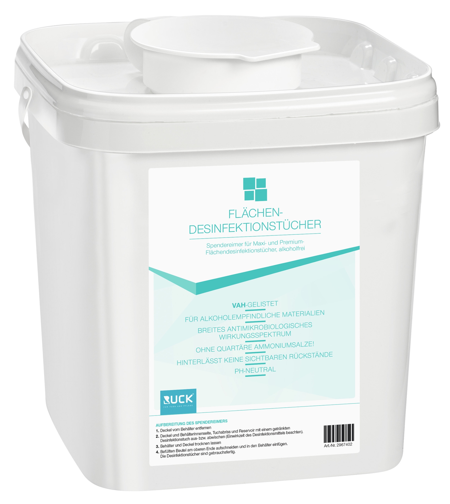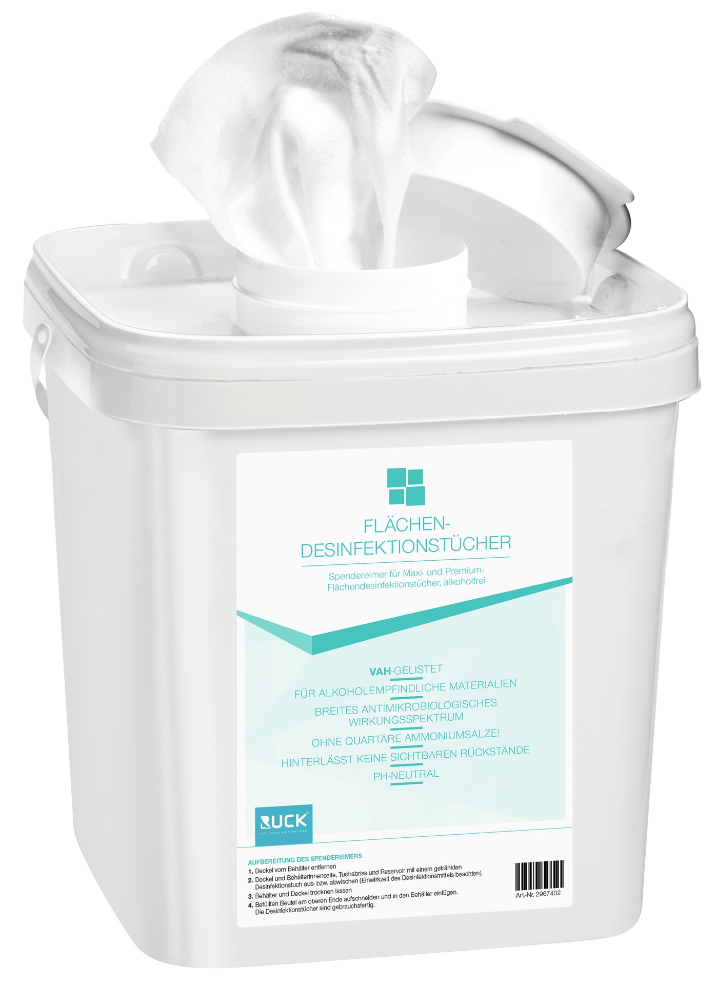 - trockene Vliestücher zum einfachen Tränken mit geeigneten und geprüften Desinfektionsmitteln im Spendereimer-System