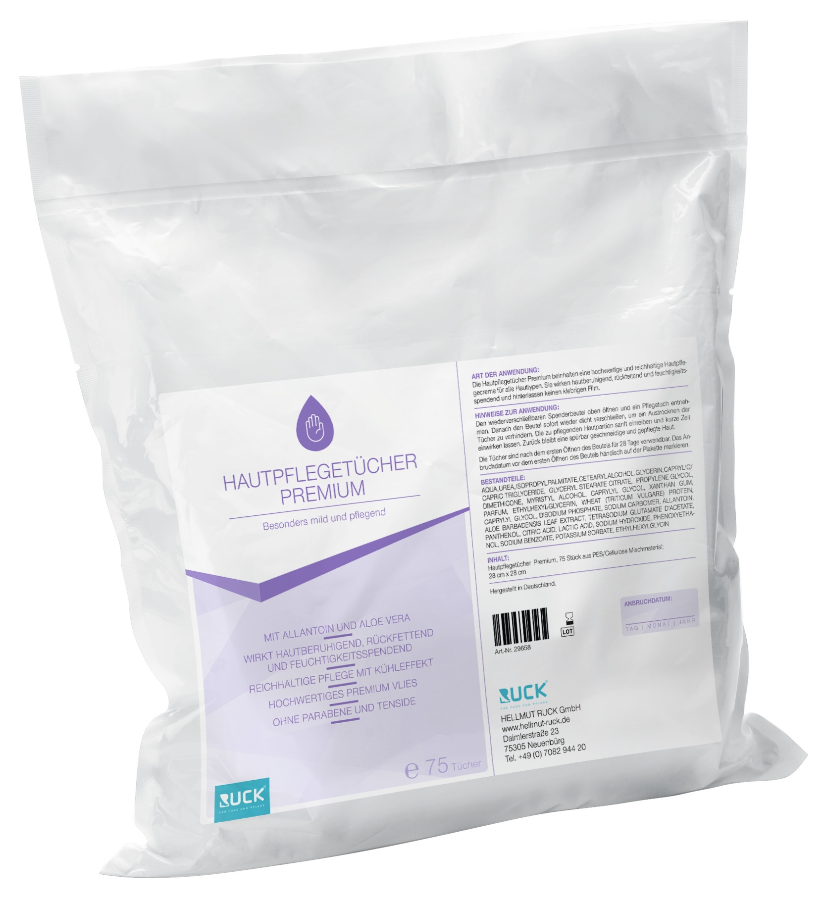 Den wiederverschließbaren Spenderbeutel oben öffnen und ein Pflegetuch entnehmen. Danach den Beutel sofort wieder dicht verschließen, um ein Austrocknen der Tücher zu verhindern. Die Tücher sind nach dem ersten Öffnen des Beutels für 28 Tage verwendbar. Das Anbruchdatum vor dem ersten Öffnen des Beutels händisch auf der Plakette markieren.