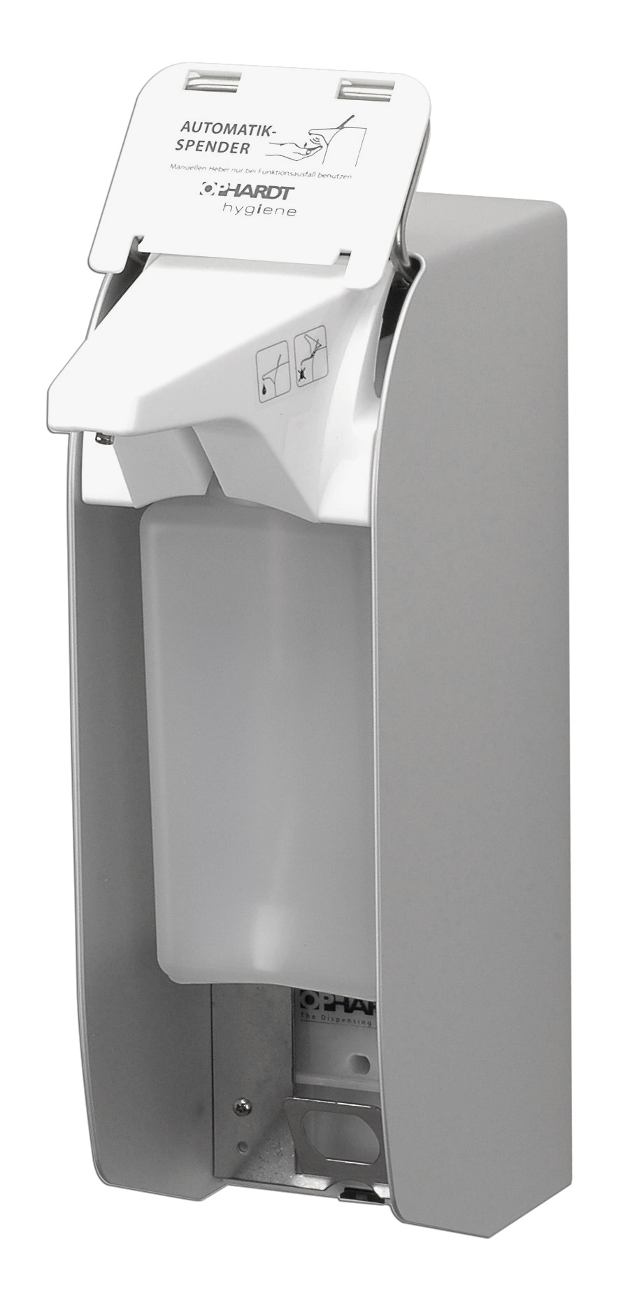 Stabil und formschön. Dieser Wandspender mit komfortabler Sensortechnologie besteht aus unverwüstlichem Aluminium und arbeitet batteriebetreiben. Die Dosierung der Pumpe ist einstellbar mit ca. 0,75 / 1,0 / 1,2 und 1,5 ml pro Hub. Für die berührungslose Entnahme von Desinfektionsmittel und Flüssigseife. Für bessere Übersicht kann der Inhalt mit beiliegenden Clips gekennzeichnet werden. Ein manueller Notbedienhebel gewährleistet die Entnahme auch bei Stromausfall. Für 500 ml-Euroflaschen geeignet, Pumpenwechsel durch Frontentnahme, Edelstahlpumpe (autoklavierbar bei 134 °C) und Leerflasche sind enthalten.