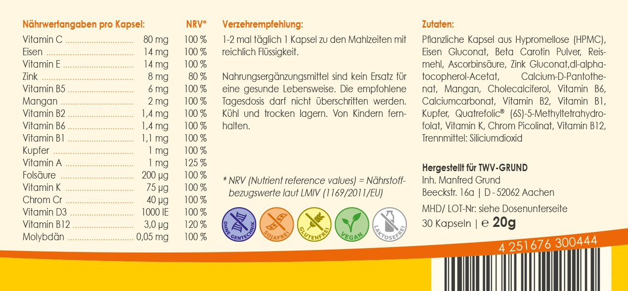 Pflanzliche Kapsel aus Hypromellose (HPMC), Eisen Gluconat, Beta Carotin Pulver, Reis- mehl, Ascorbinsäure, Zink Gluconat,dl-alpha- tocopherol-Acetat, Calcium-D-Pantothe- nat, Mangan, Cholecalciferol, Vitamin B6, Calciumcarbonat, Vitamin B2, Vitamin B1, Kupfer, Quatrefolic® (6S)-5-Methyltetrahydro- folat, Vitamin K, Chrom Picolinat, Vitamin B12, Trennmittel: Siliciumdioxid