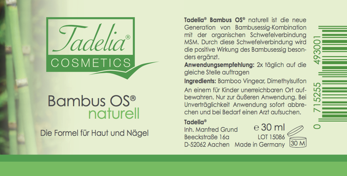 Tadelia Bambus OS naturell ist die neue Generation von Bambusessig in Kombination mit der organischen Schwefelverbindung MSM. Diese Kombination ergänzt die positiven Wirkungen des Bambusessigs optimal. Bambusessig bietet bereits zahlreiche Anwendungsmöglichkeiten durch seine pflanzlichen Inhaltsstoffe. Tadelia Bambus OS naturell wurde speziell für die äußere Körperpflege von Füßen und Fußnägeln entwickelt.