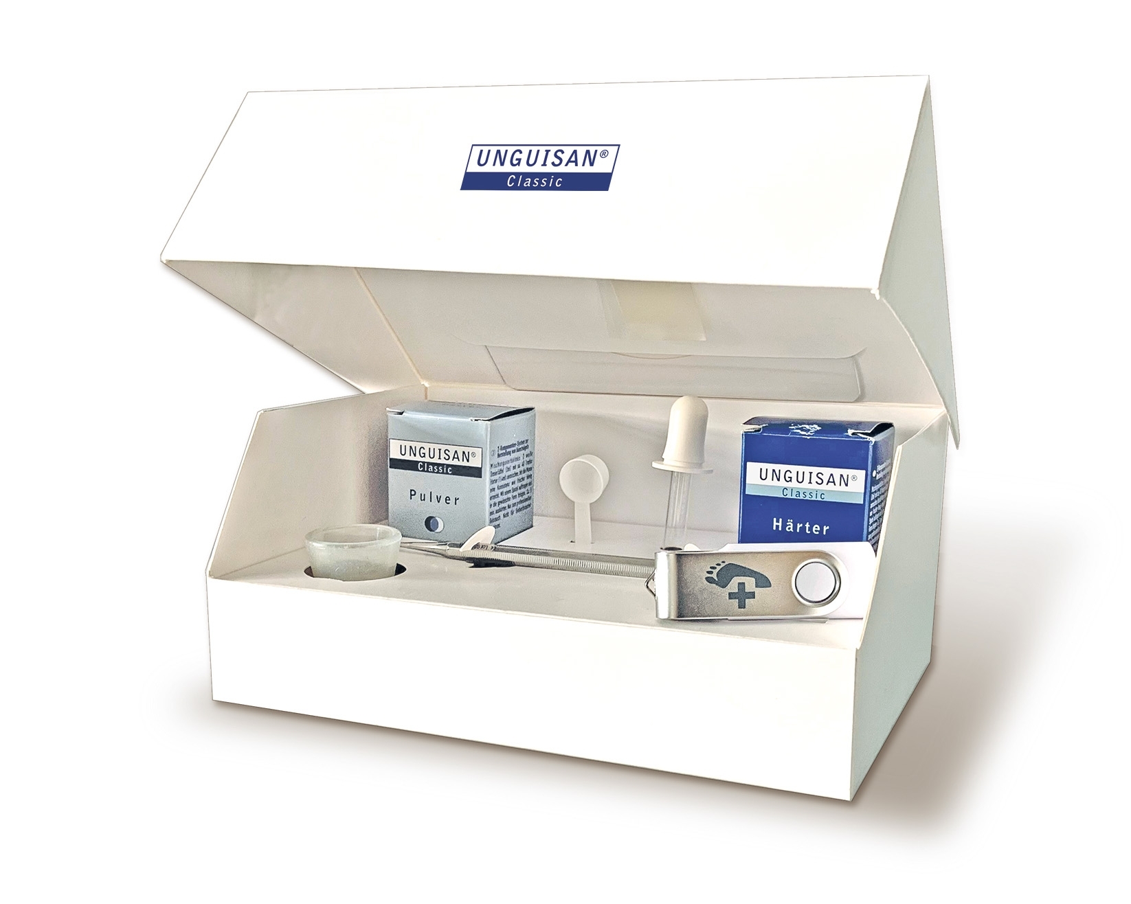Mit dem Unguisan Starter-Set erhalten Sie alles, was Sie neben Ihrem fußpflegerischen Können für die Anfertigung individuellen und ästhetischen Nagelersatzes benötigen. Das Set enthält ein 2-Komponenten-Kunstharz bestehend aus Pulver und Härterflüssigkeit. Nach dem Anmischen und nach Erreichen der richtigen Konsistenz wird die Masse mit einem Spatel aufgetragen und geformt. Hervorragend auch zur Befestigung von Orthonyxie-Spangen geeignet. Aushärtung ohne UV-Licht.